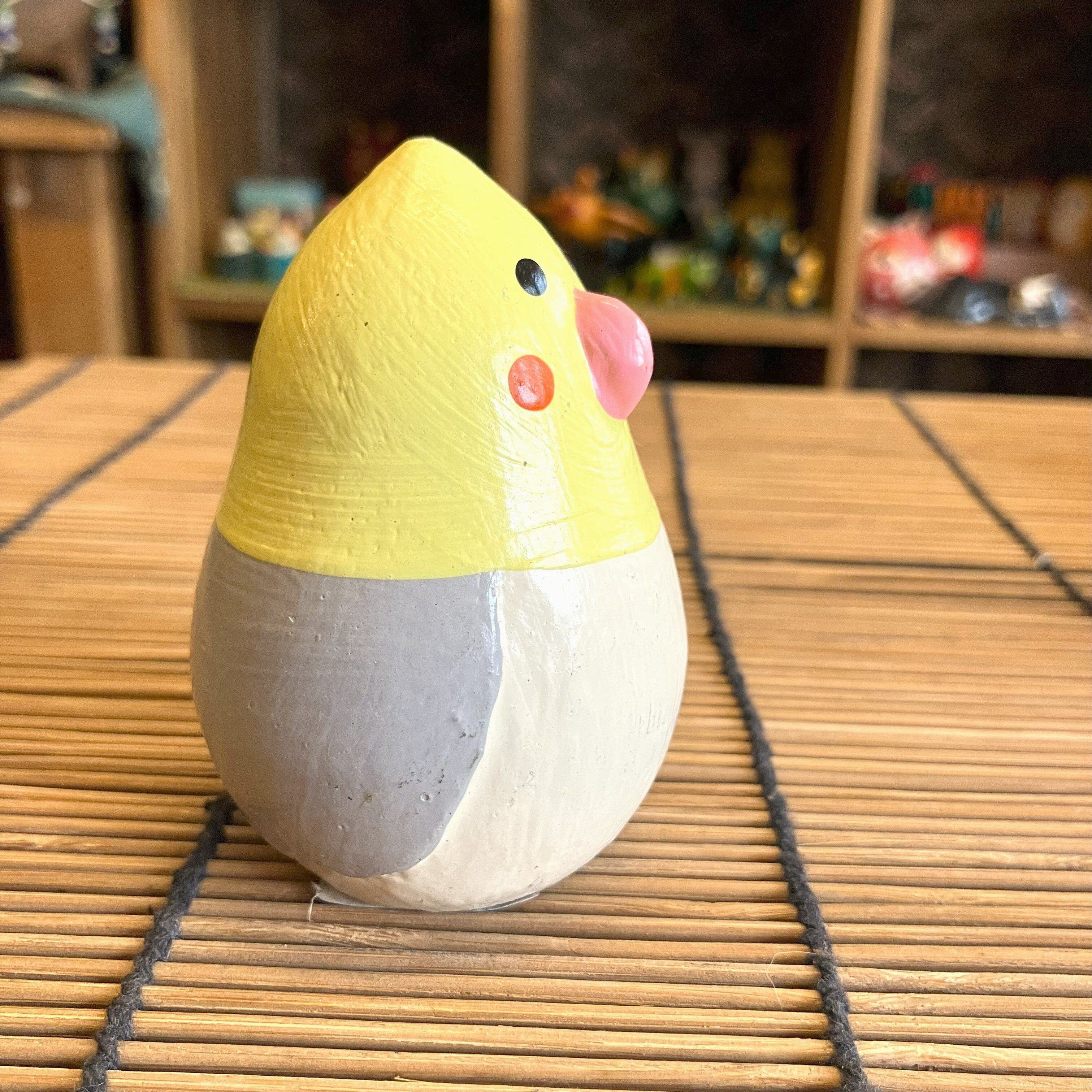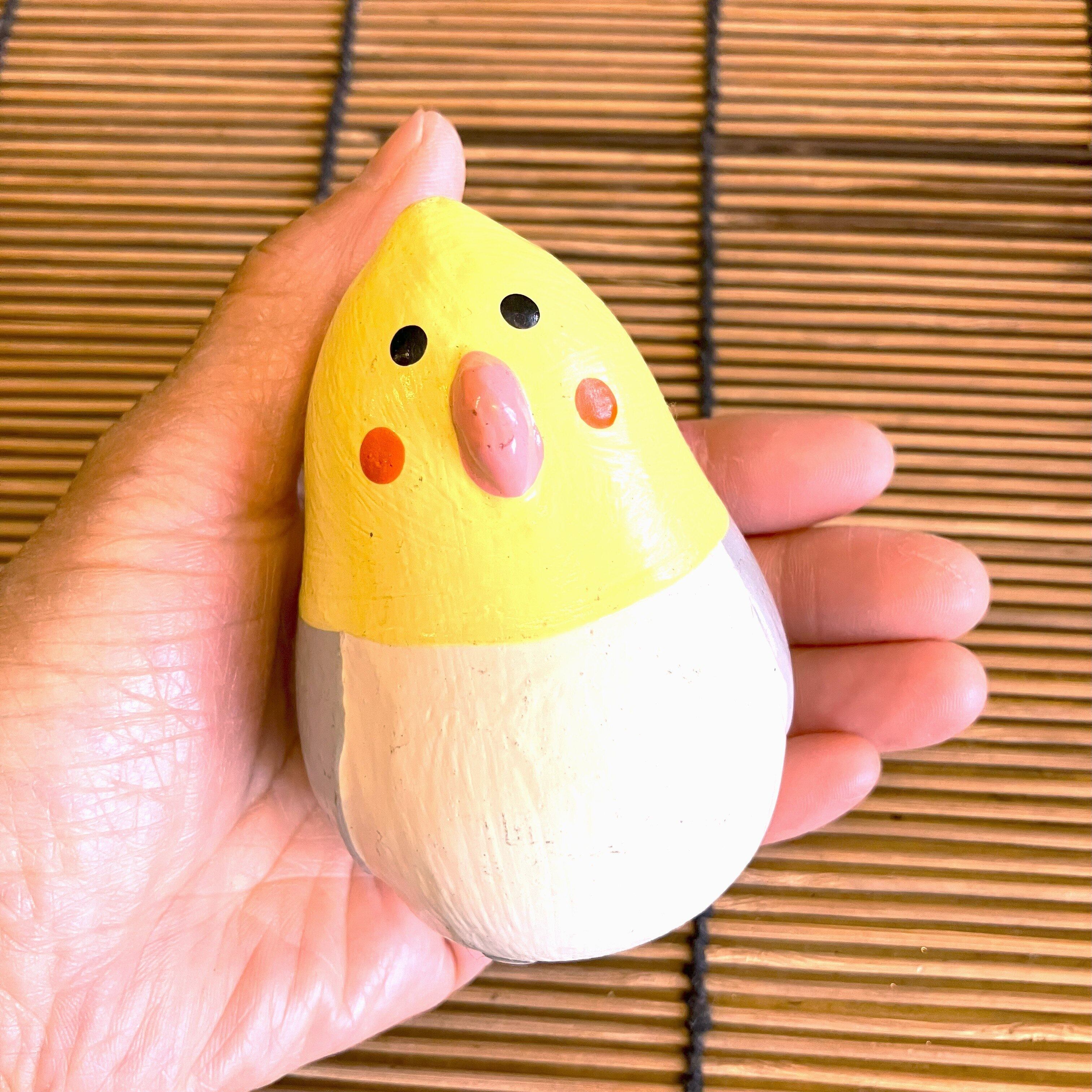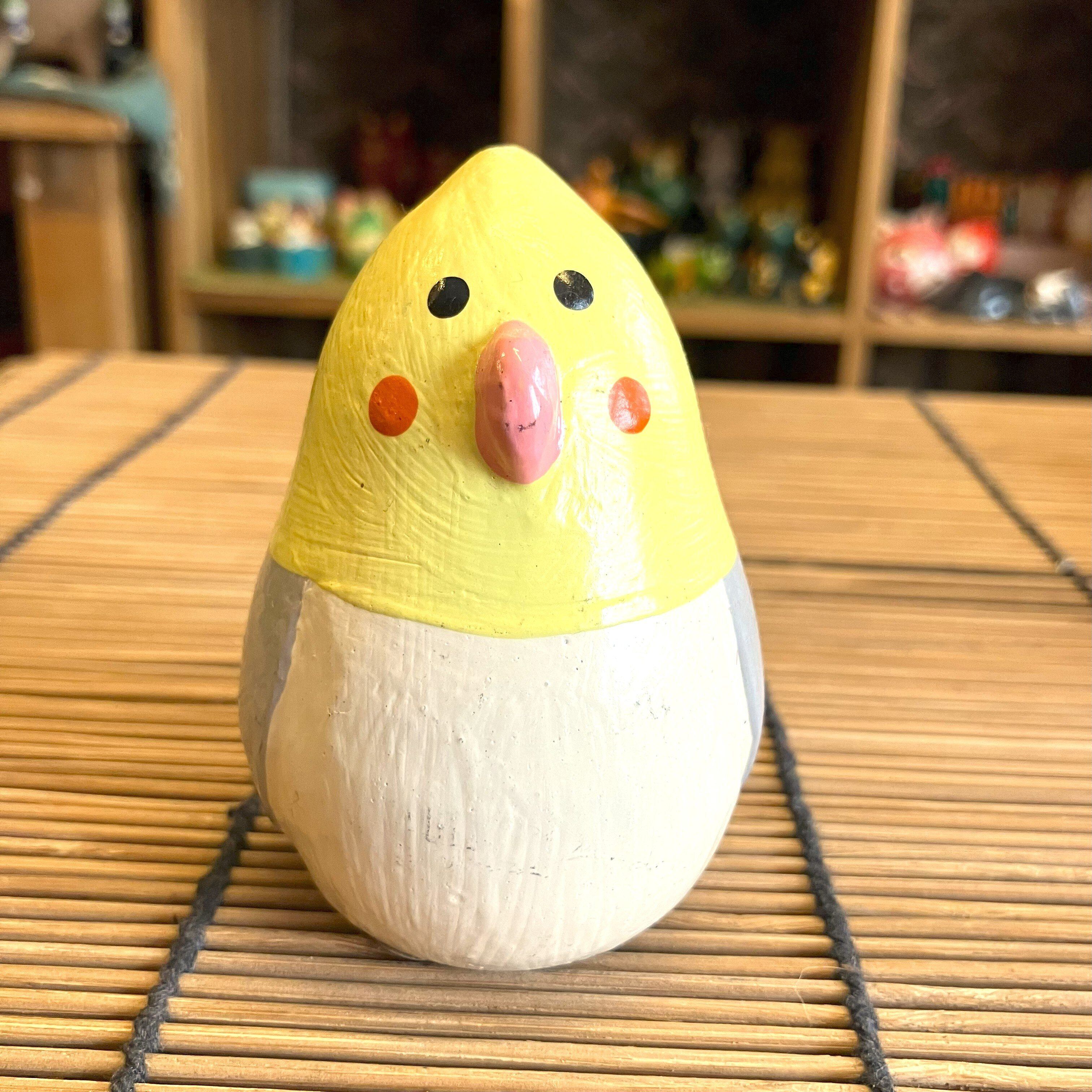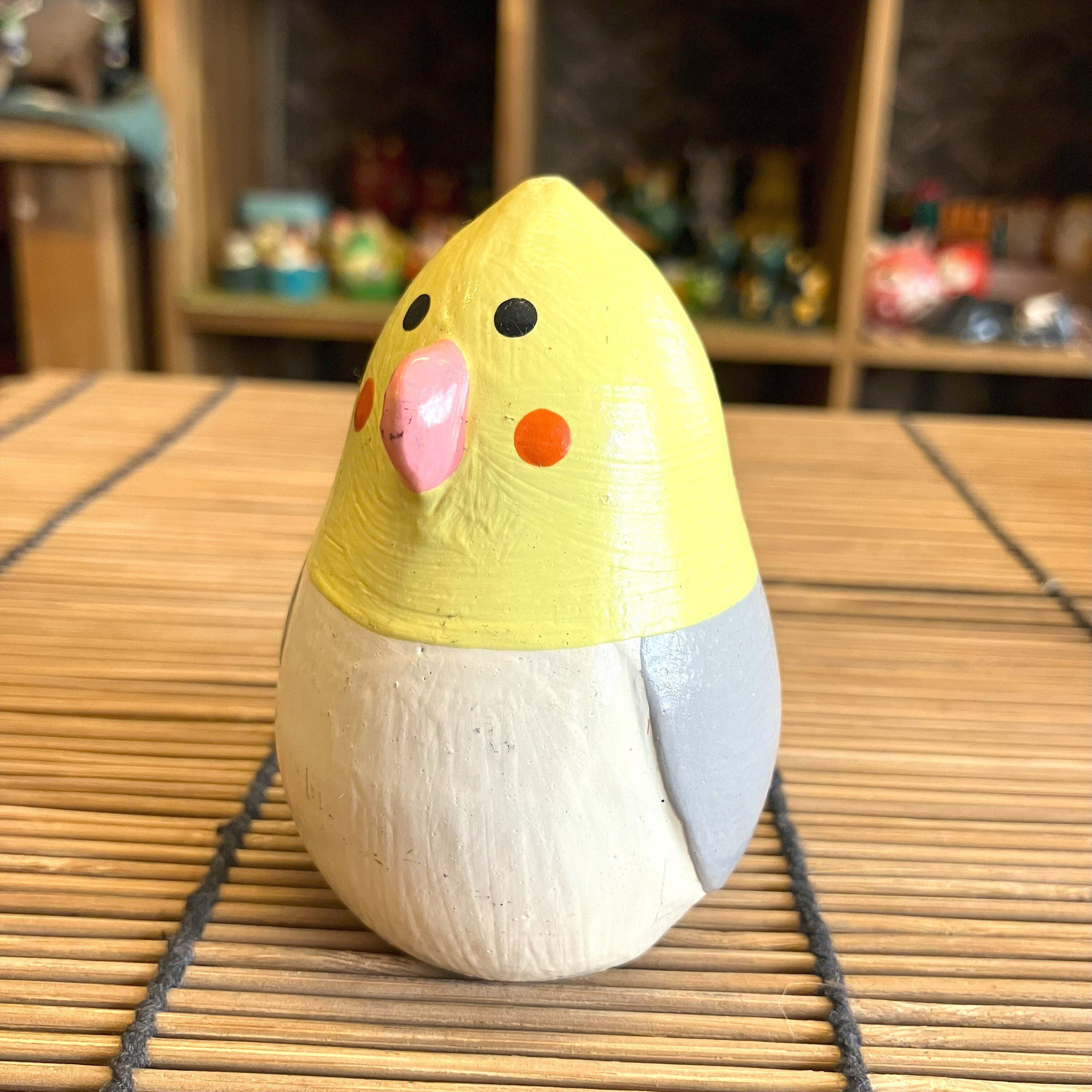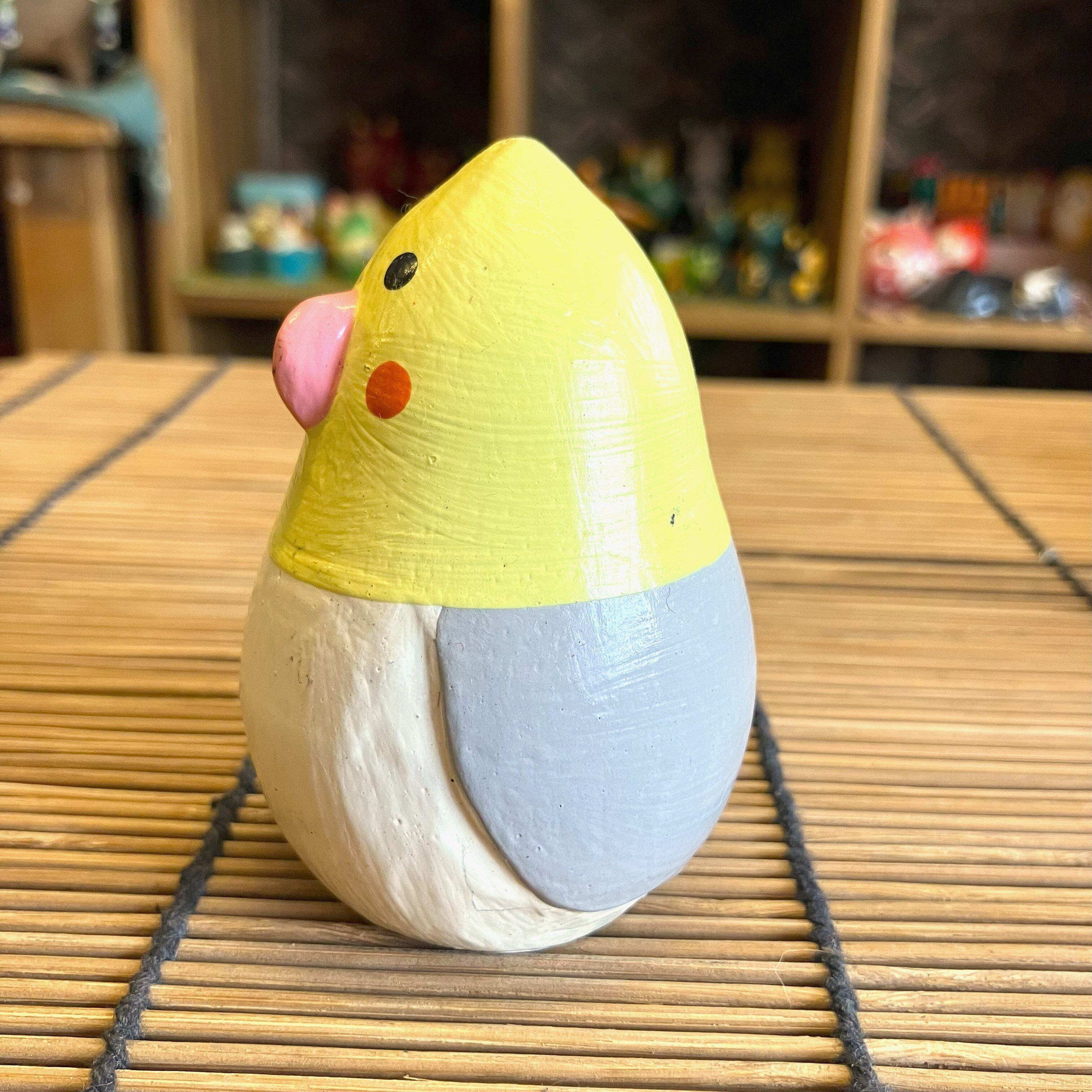たまごのようなフォルムと手のひらサイズがとっても可愛い木彫りの置物です。