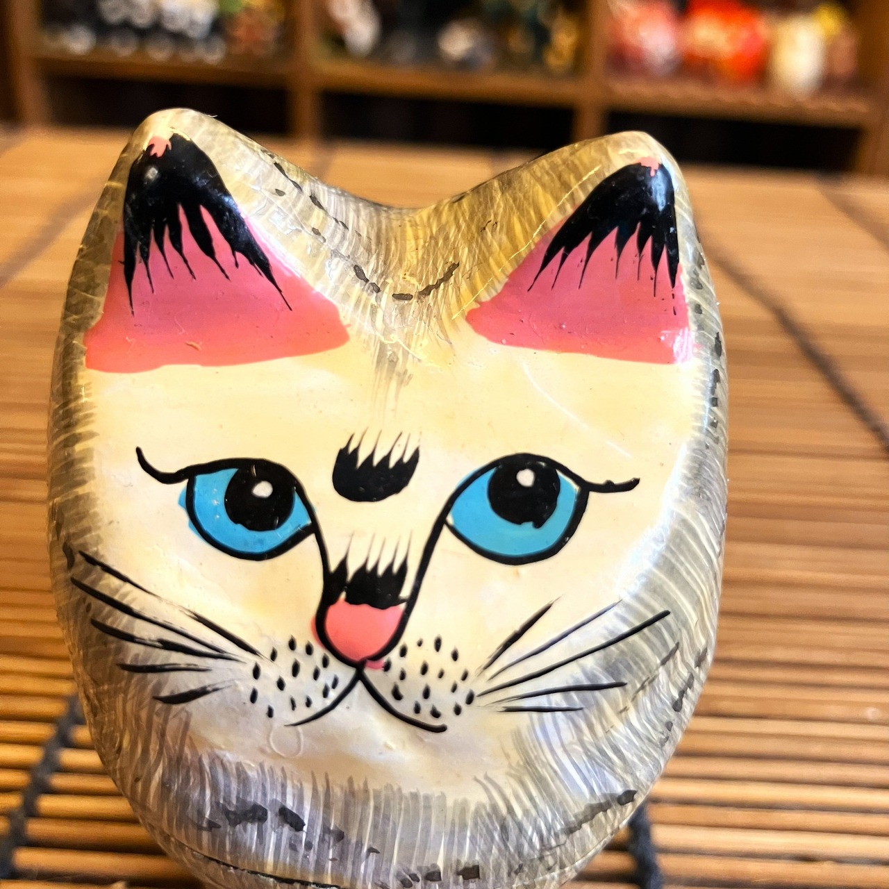 インドのカシミール地方伝統の手仕事、ペーパーマッシュのネコBOXです。
