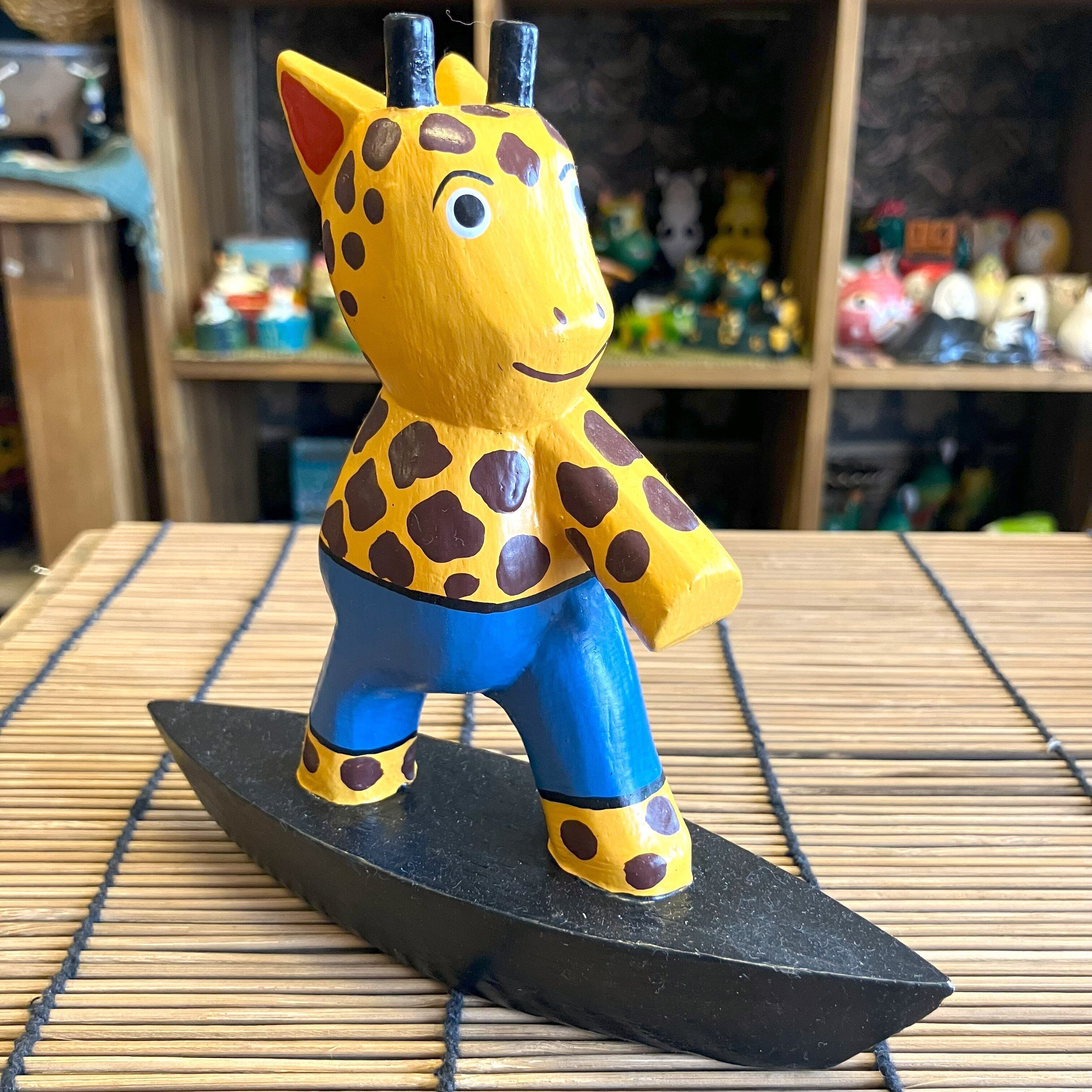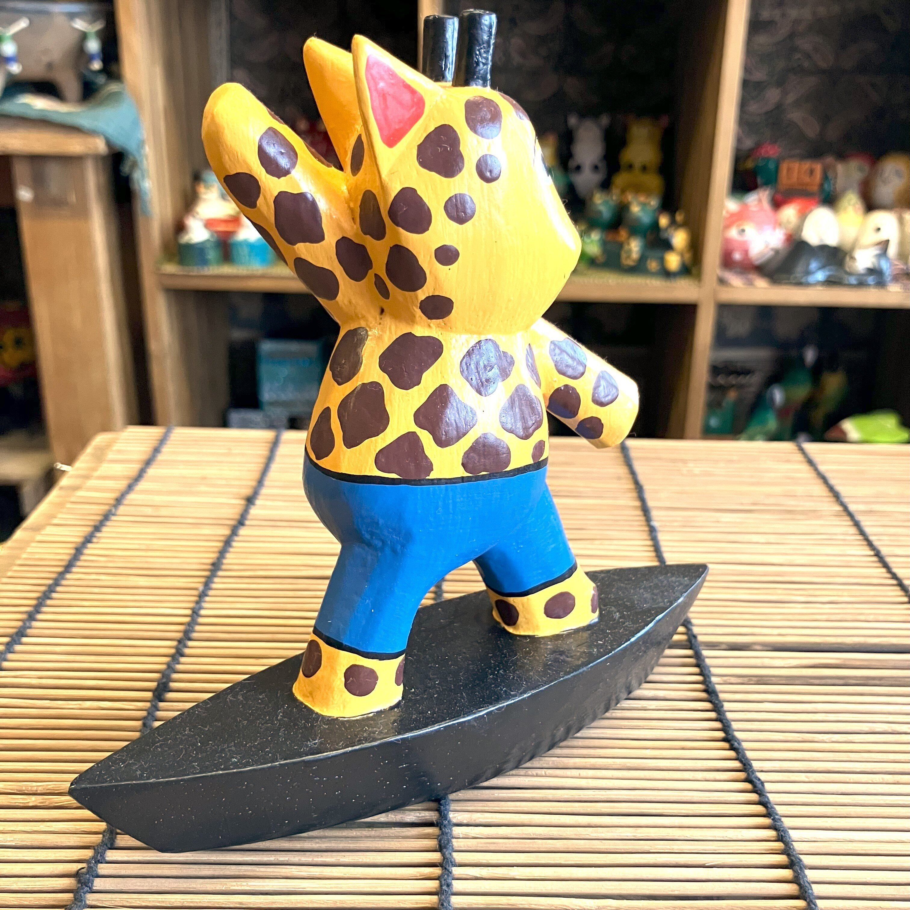 サーフィンを楽しむ可愛いキリンの木彫りオブジェです。