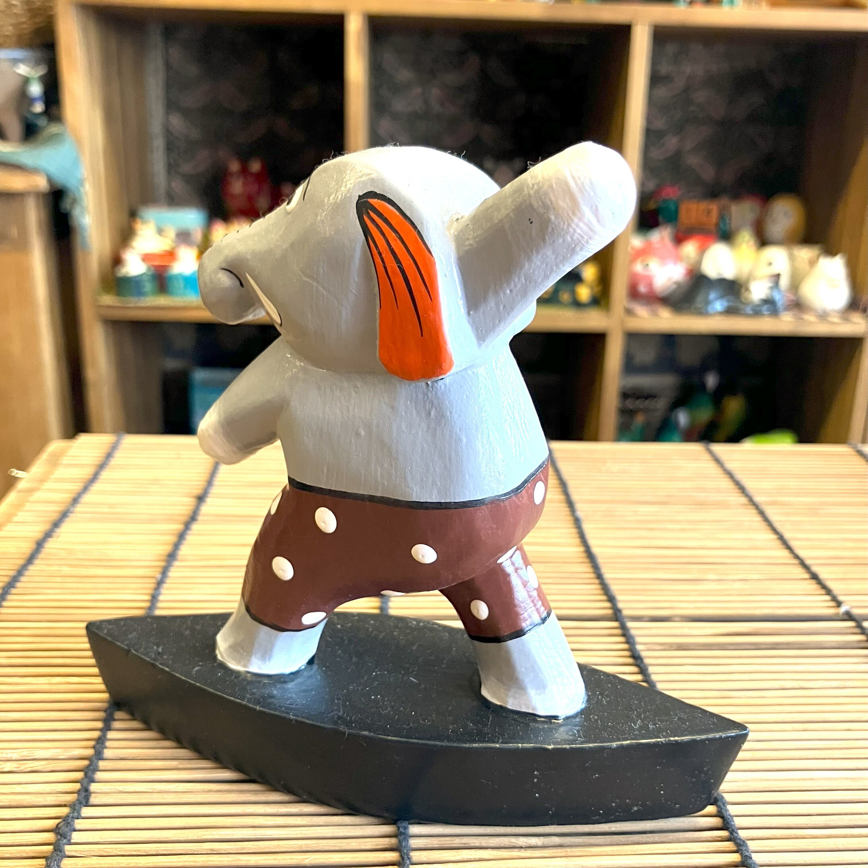 サーフィンを楽しむ可愛いゾウの木彫りオブジェです。