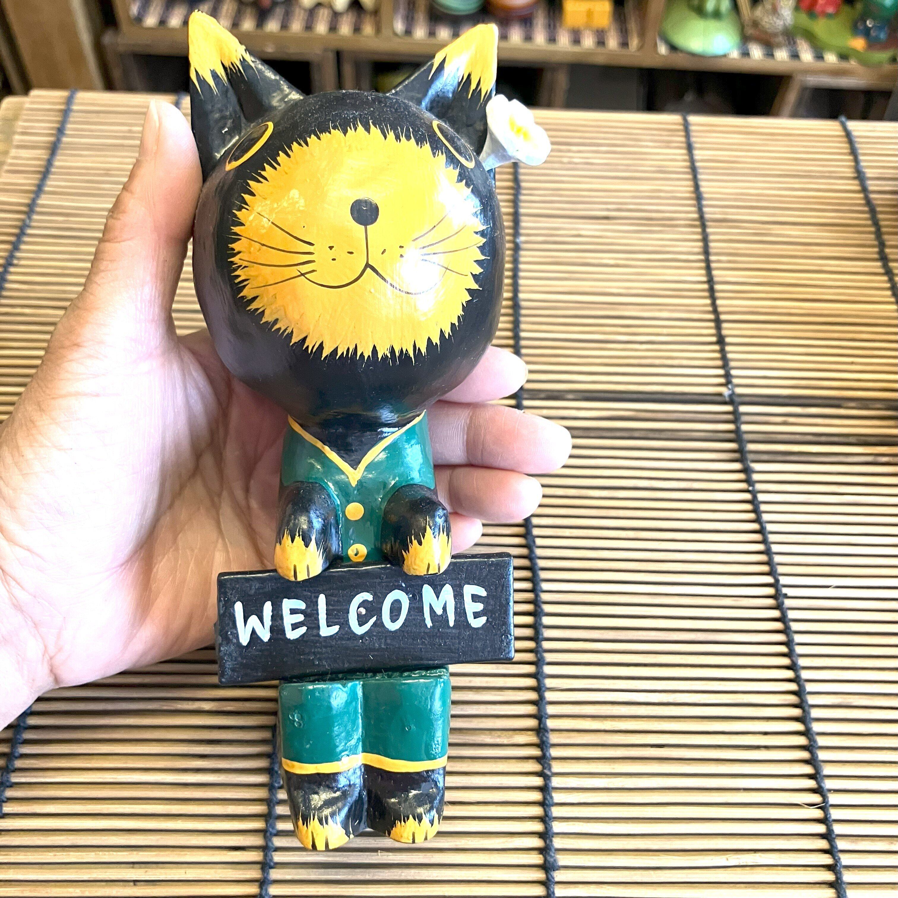 ウェルカムボードを持つ少し大き目のネコオブジェです。