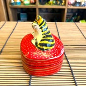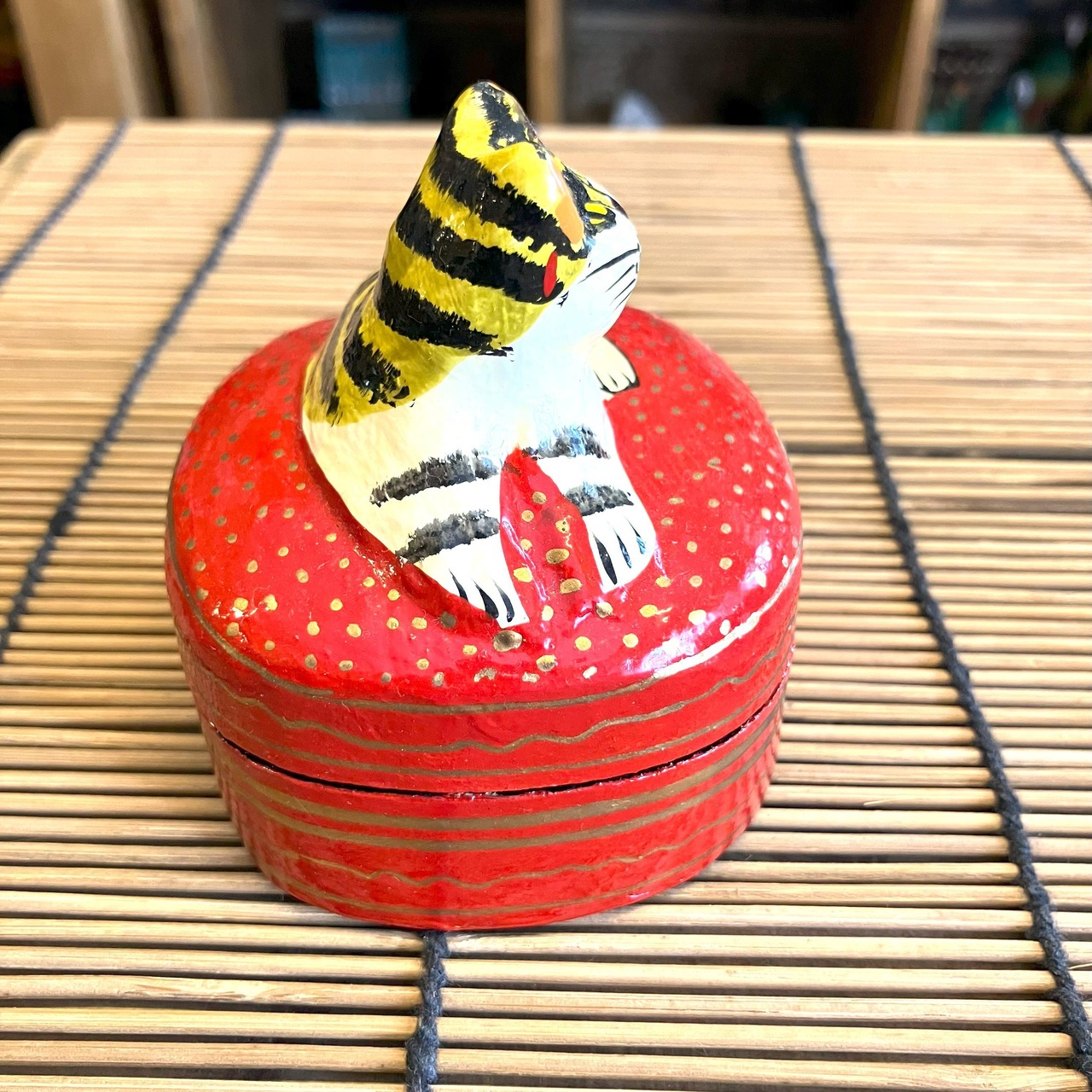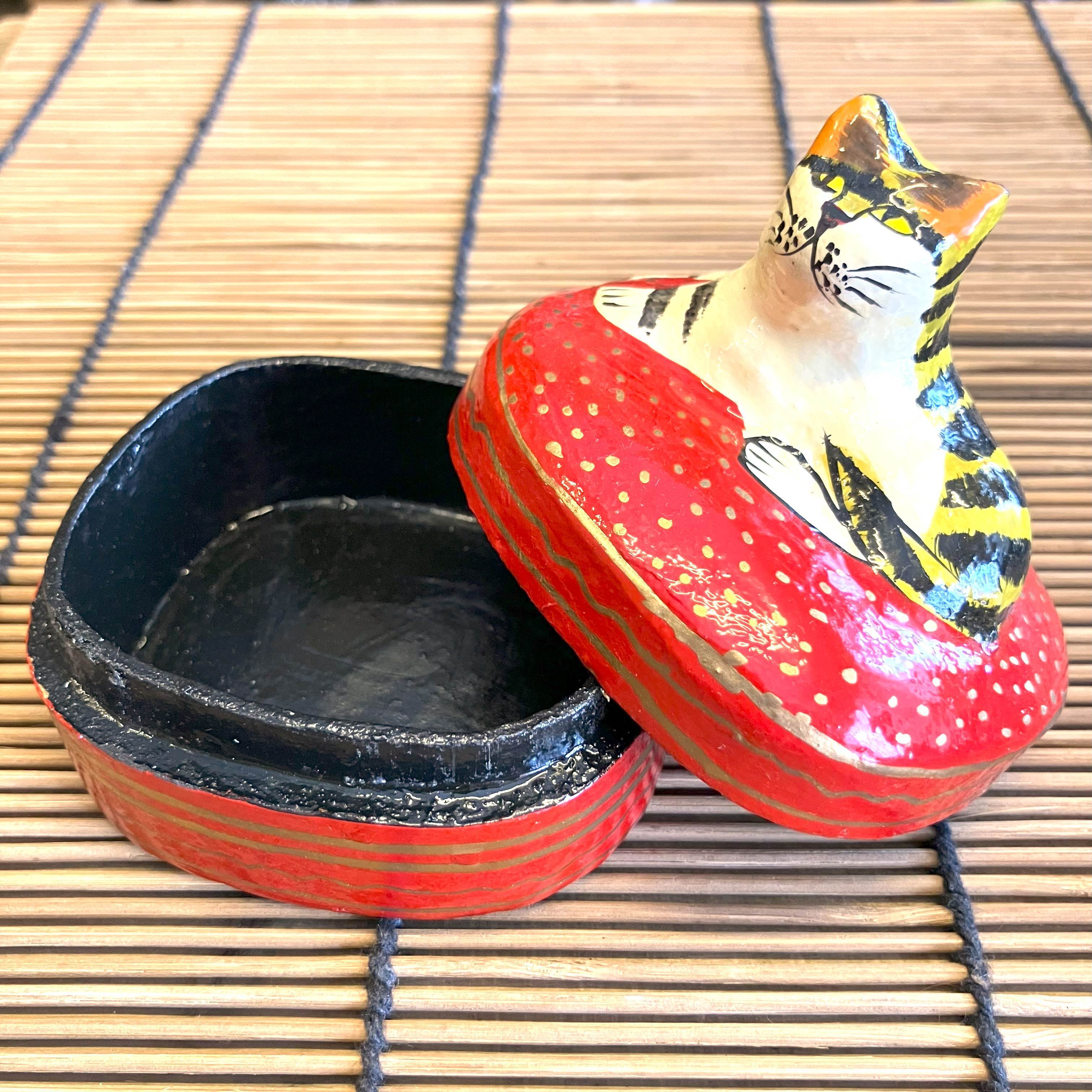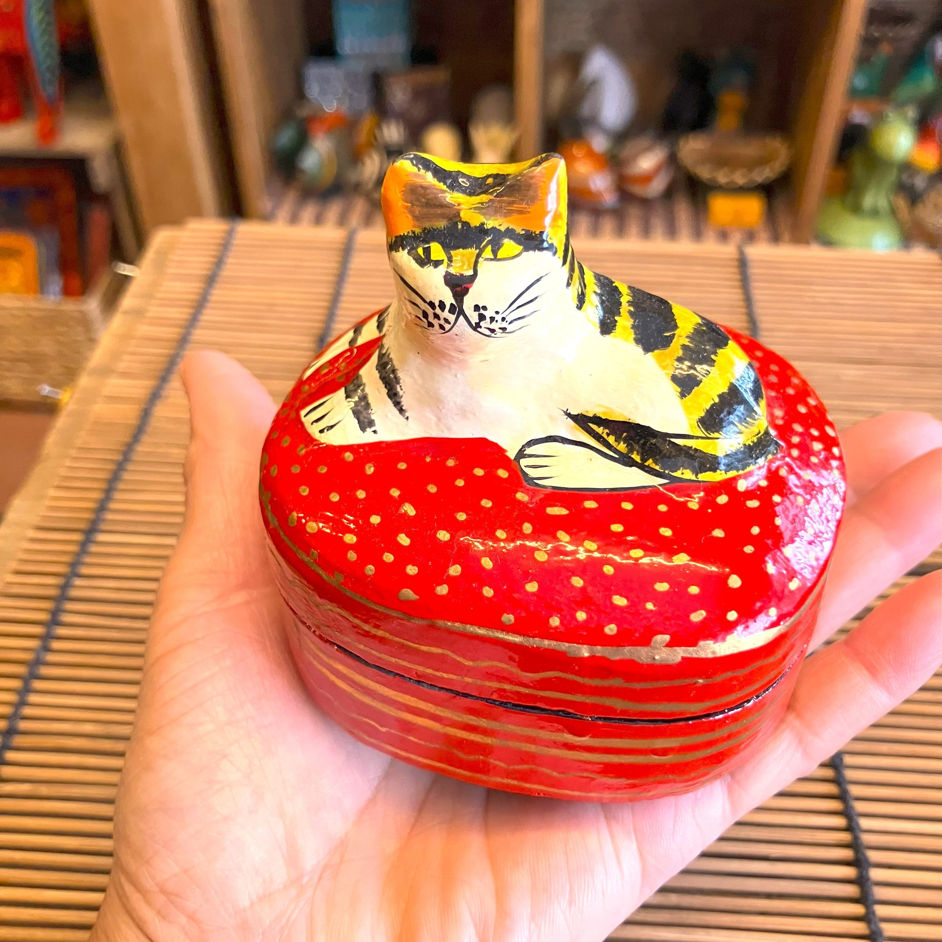 インドのカシミール地方伝統の手仕事、ペーパーマッシュのネコBOXです。