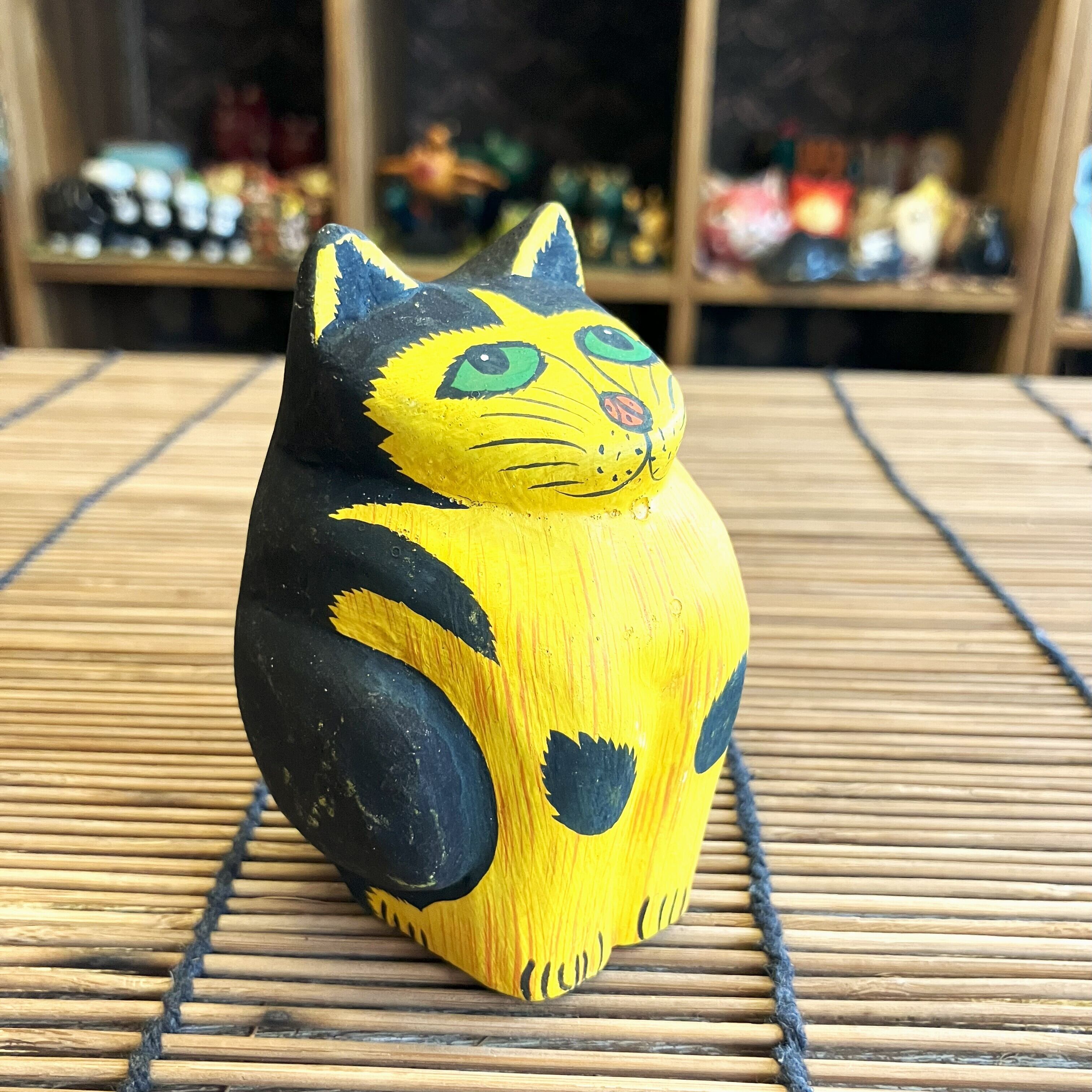 エスニックで独特の雰囲気がある木彫りネコのオブジェです。