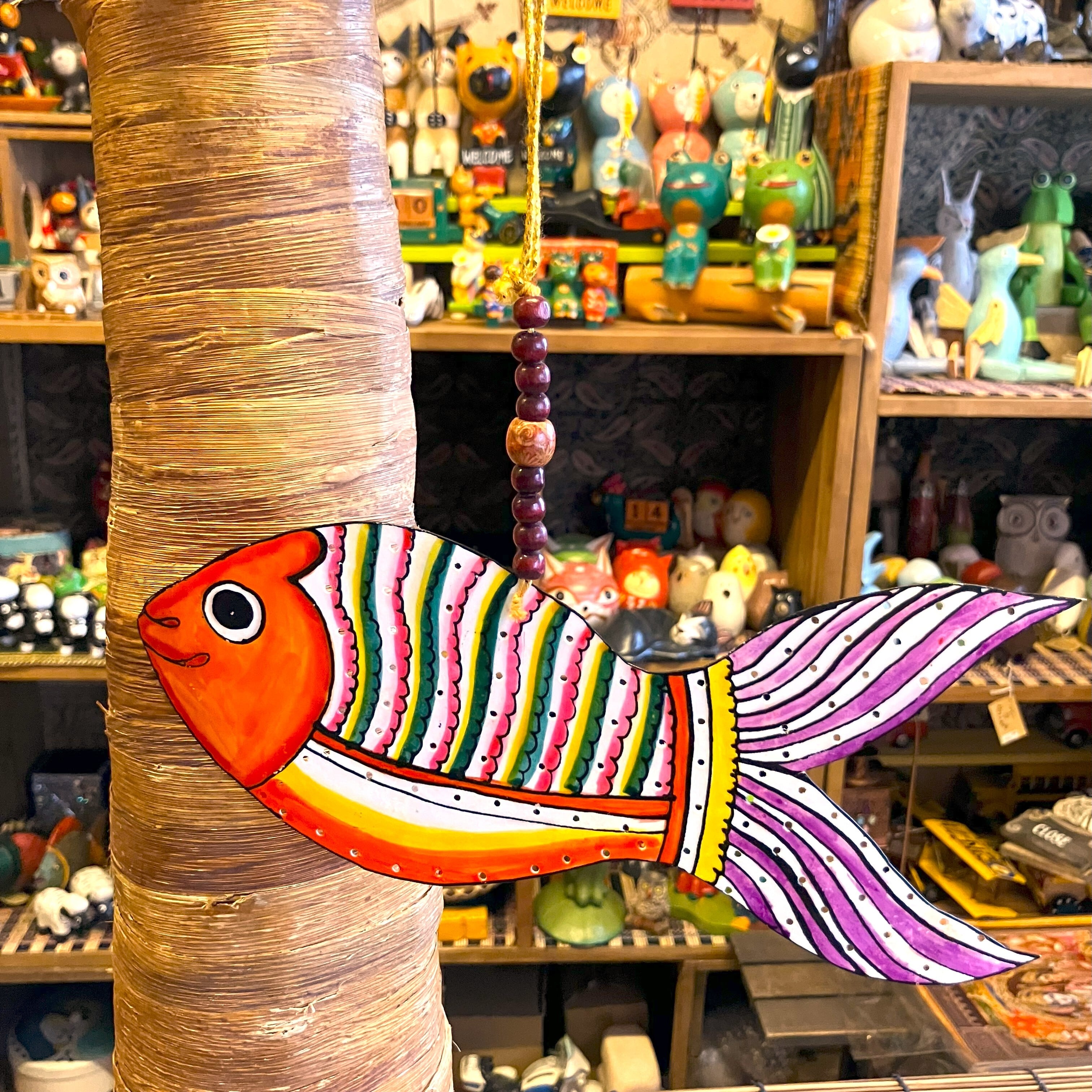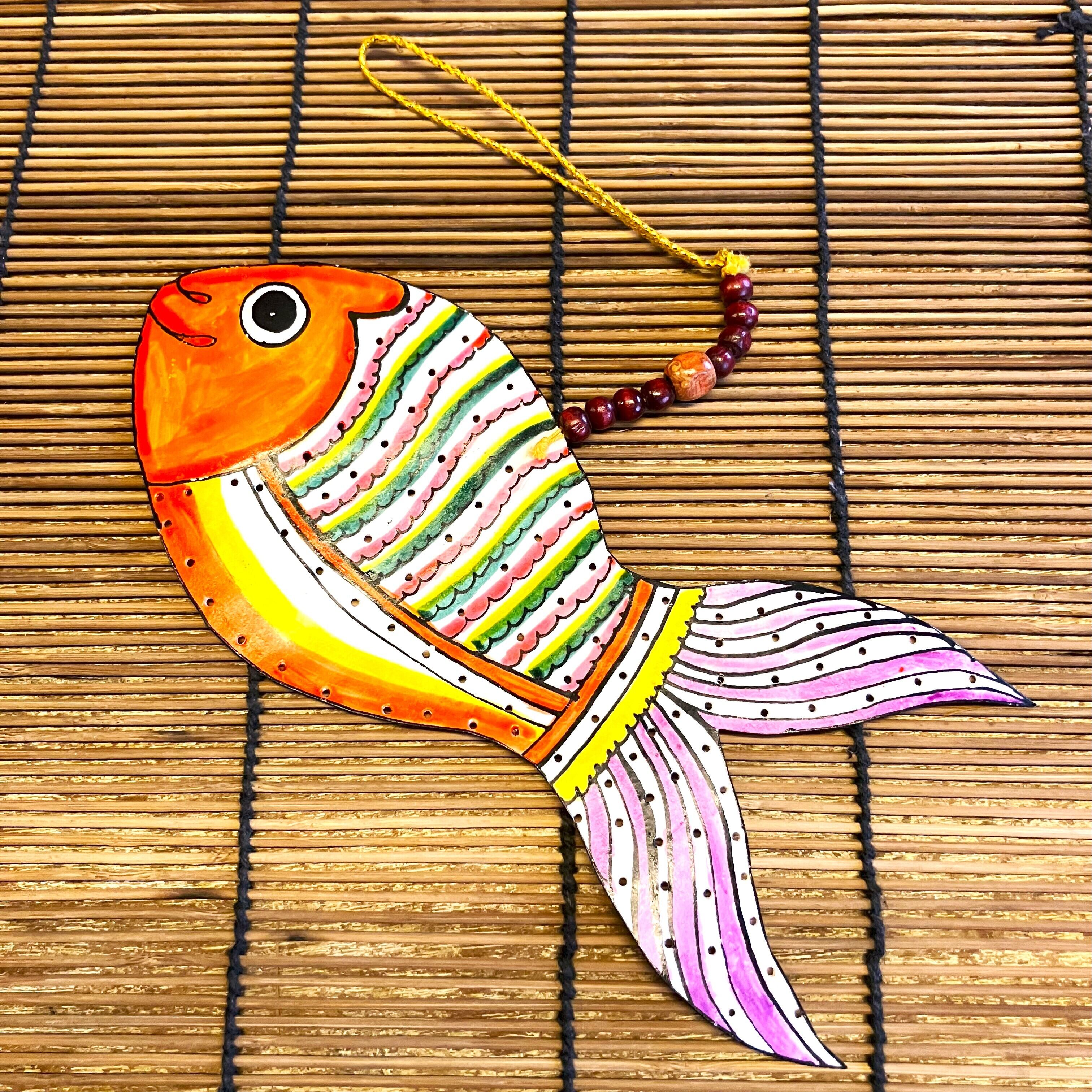 ポール・ボマラータと呼ばれるインドの伝統的な影絵劇で使用される魚をオーナメントにしています。