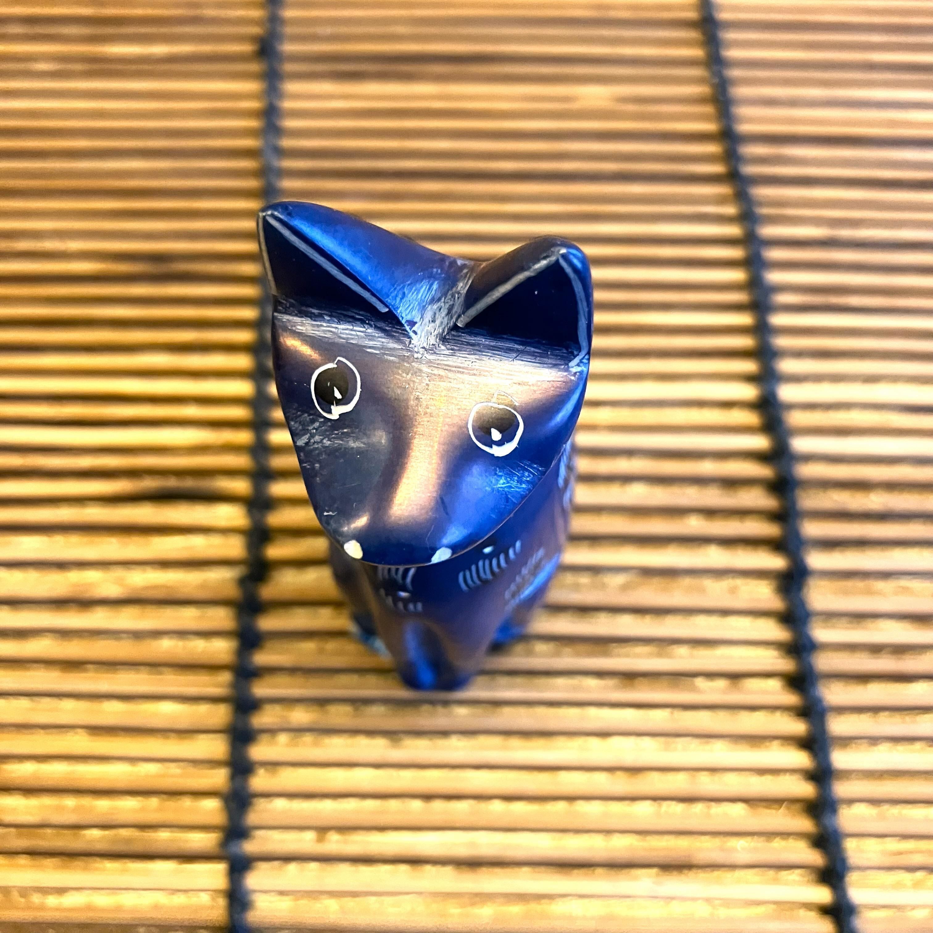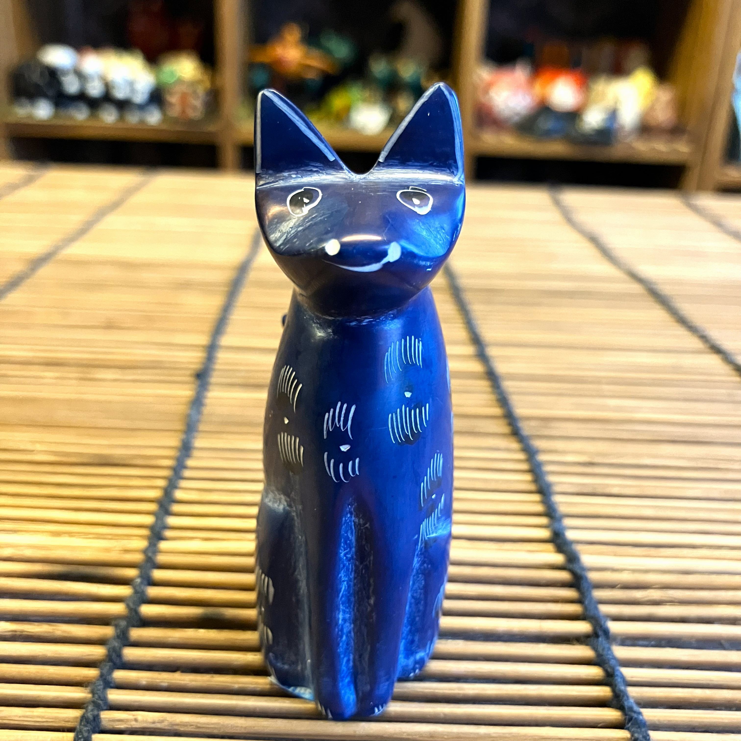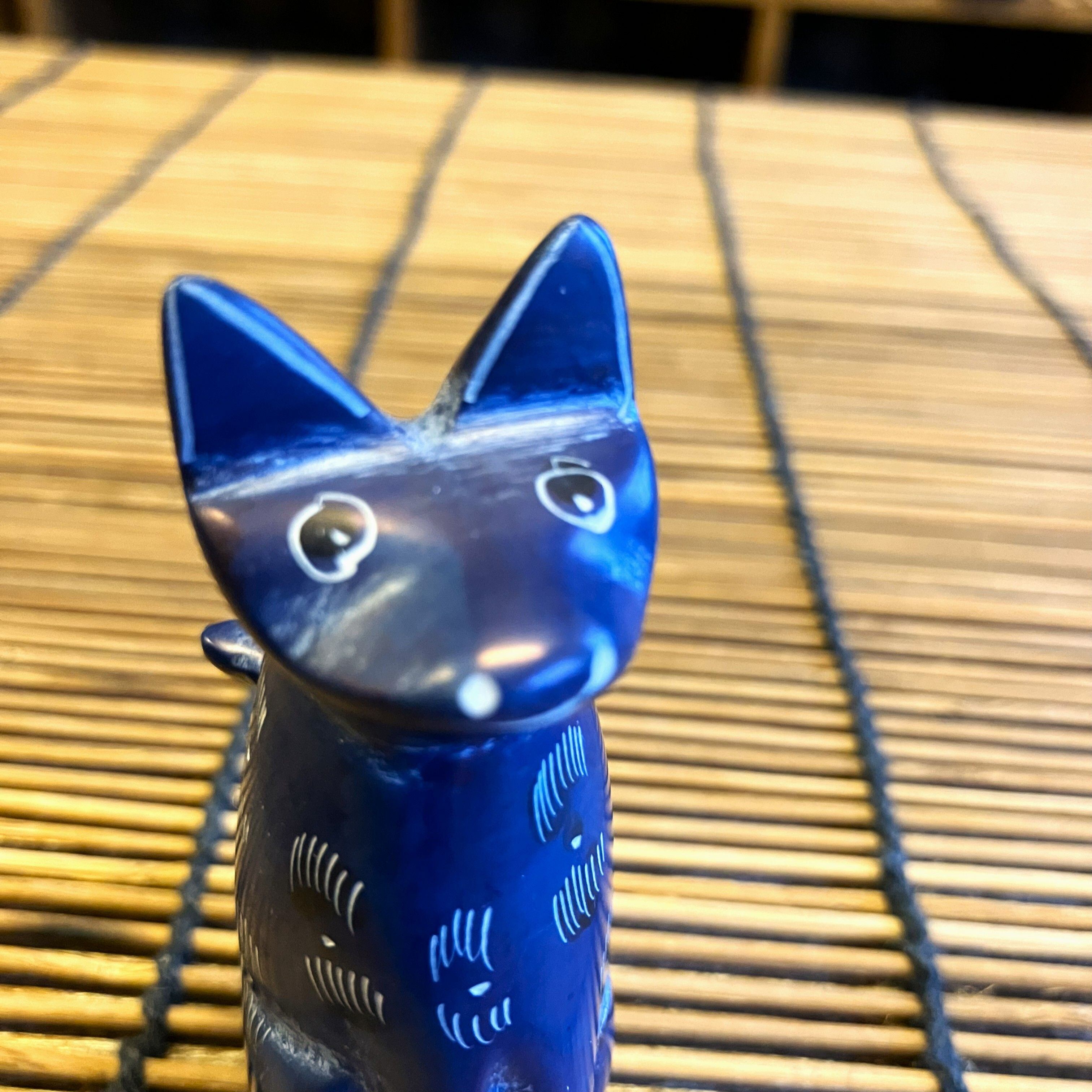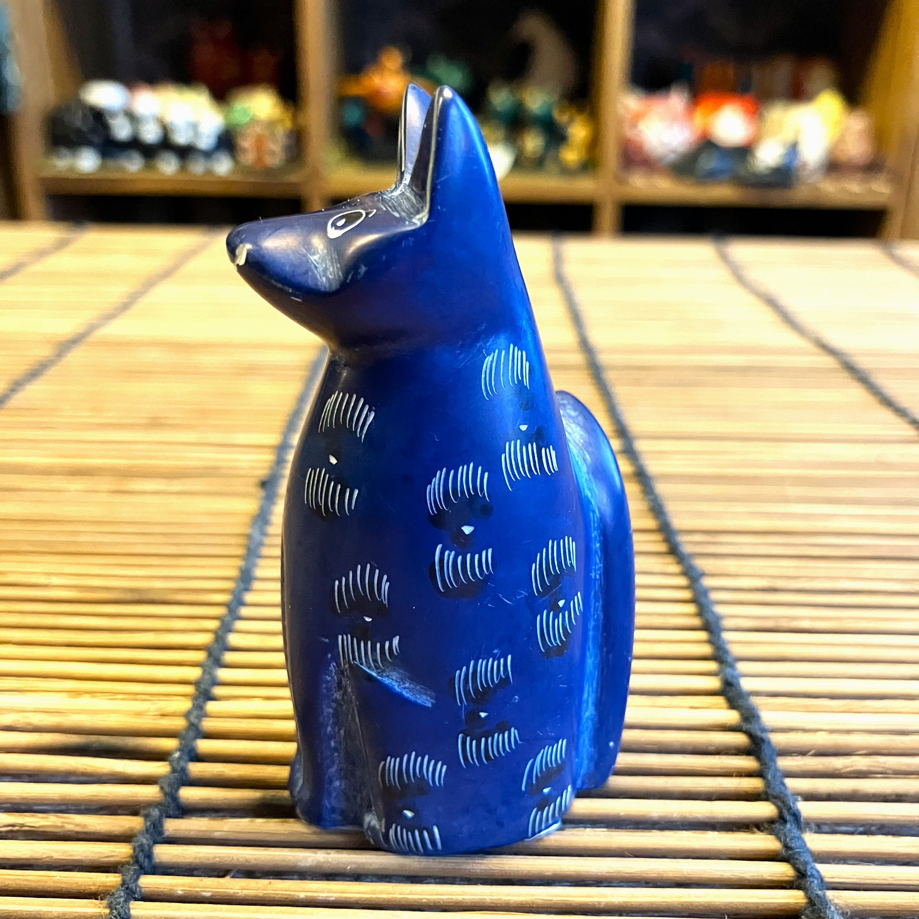 ケニアの手作りオブジェで小さなブルーのネコさんです。