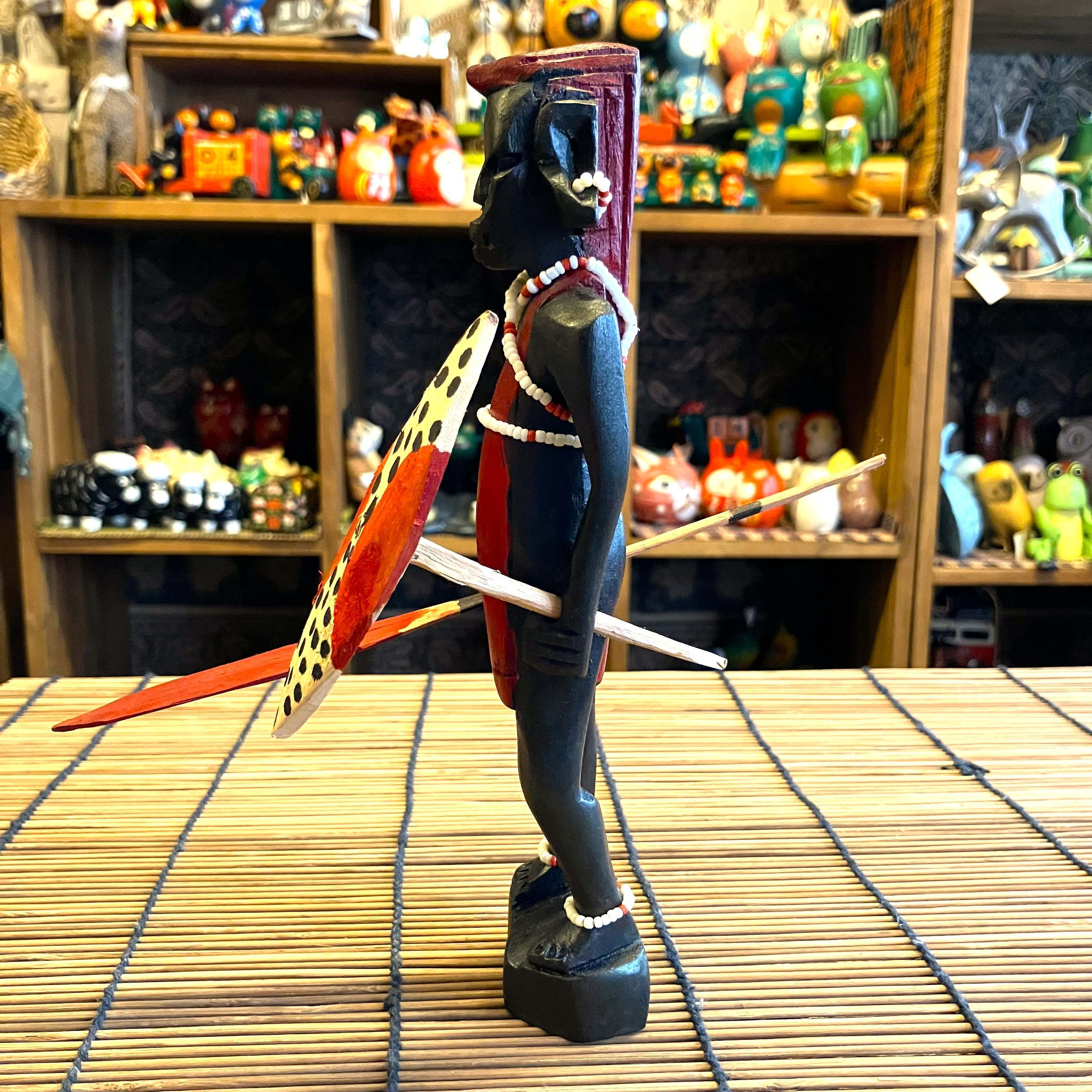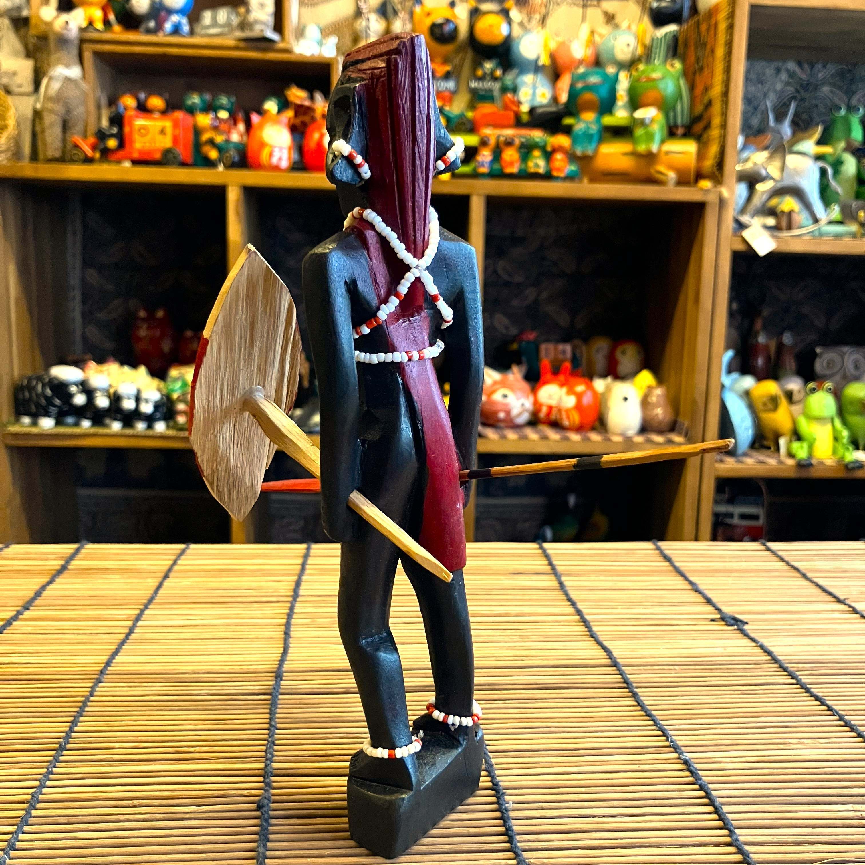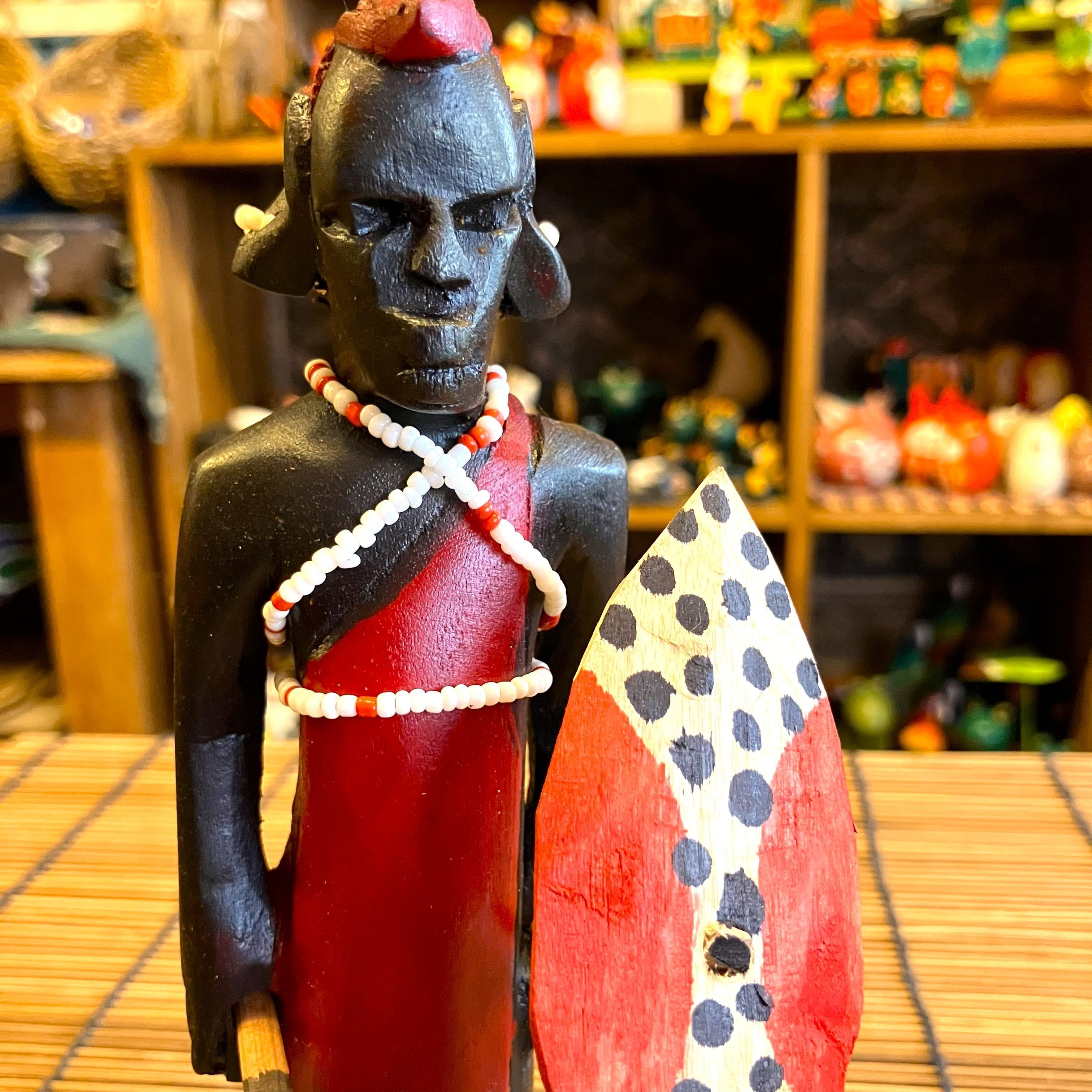 ケニアの手作り、木彫りオブジェでマサイ戦士の人形です。