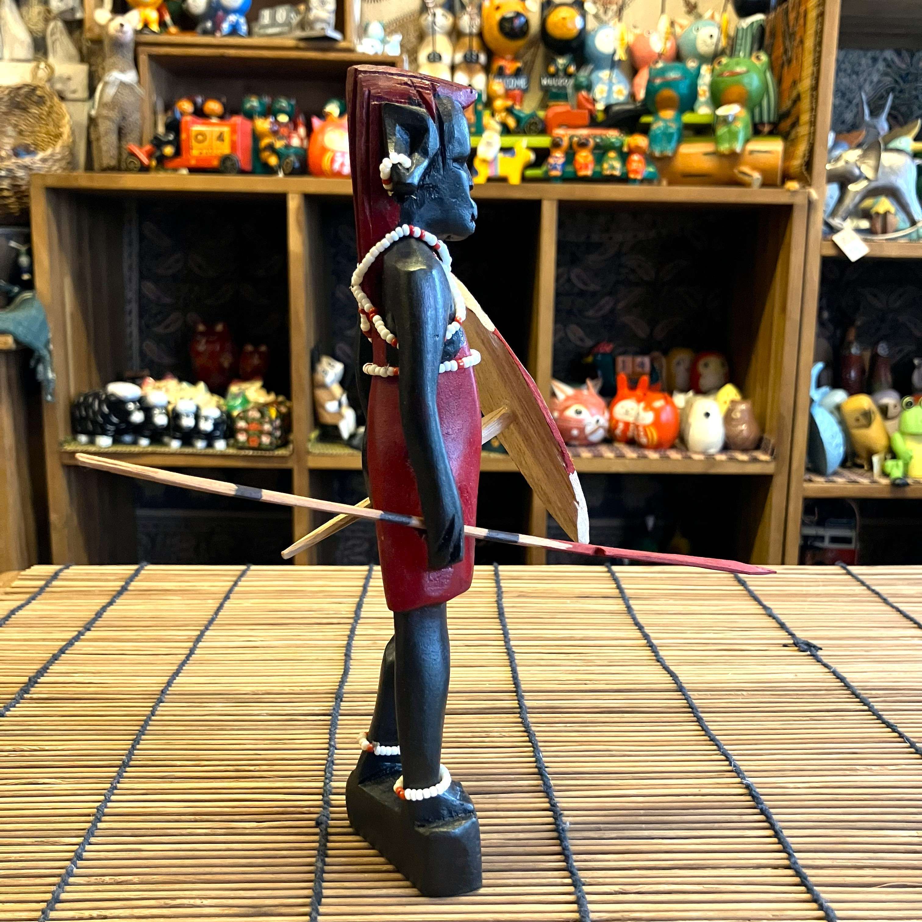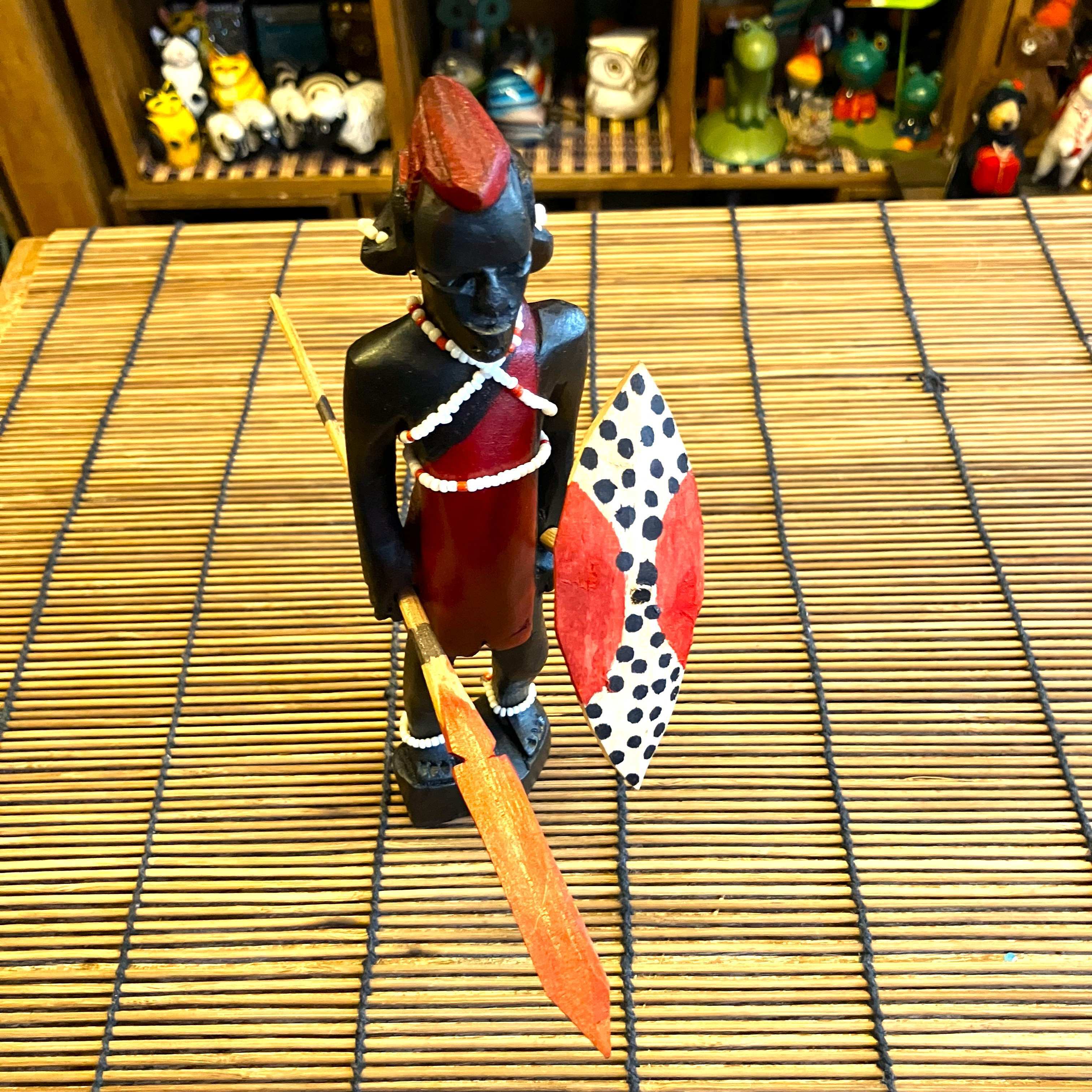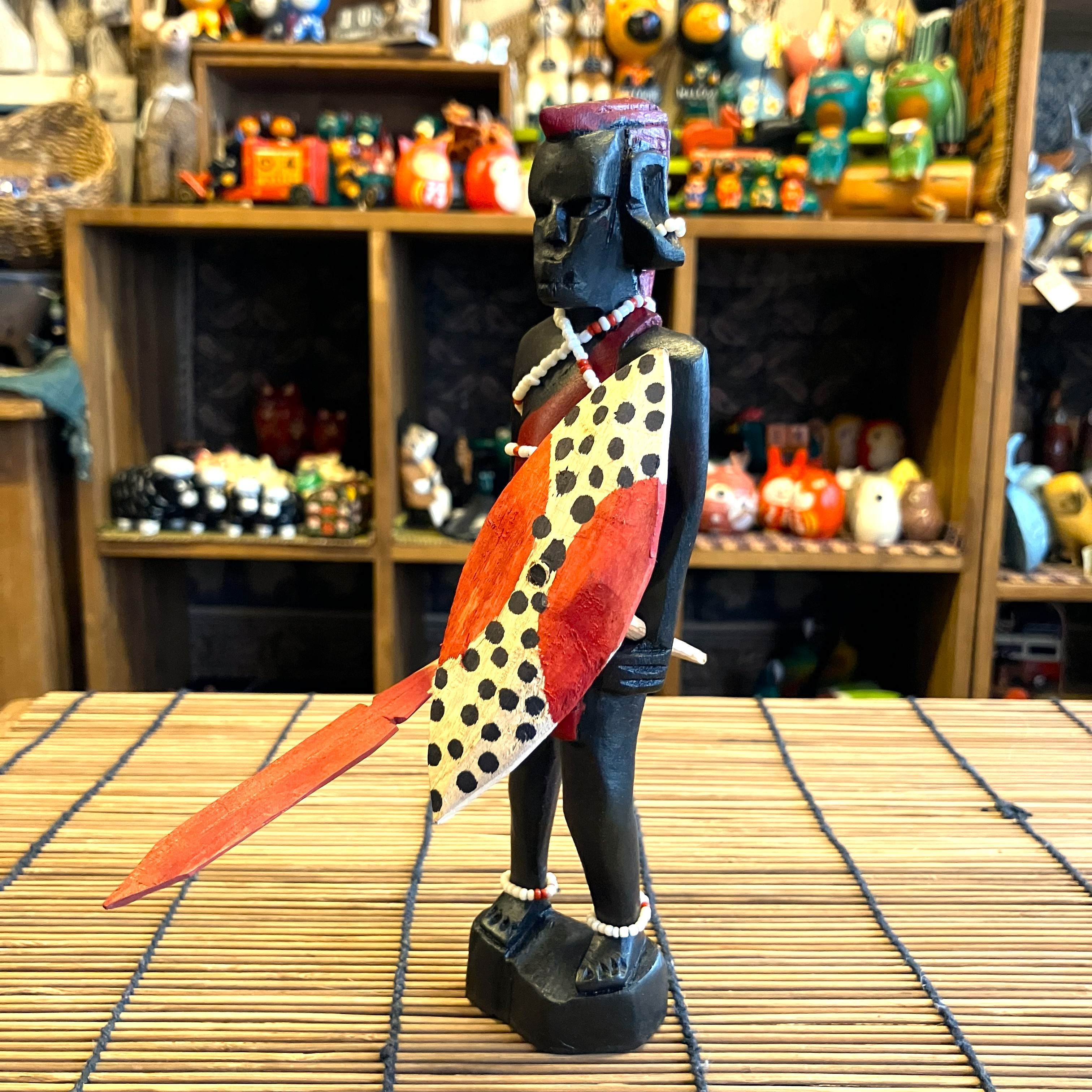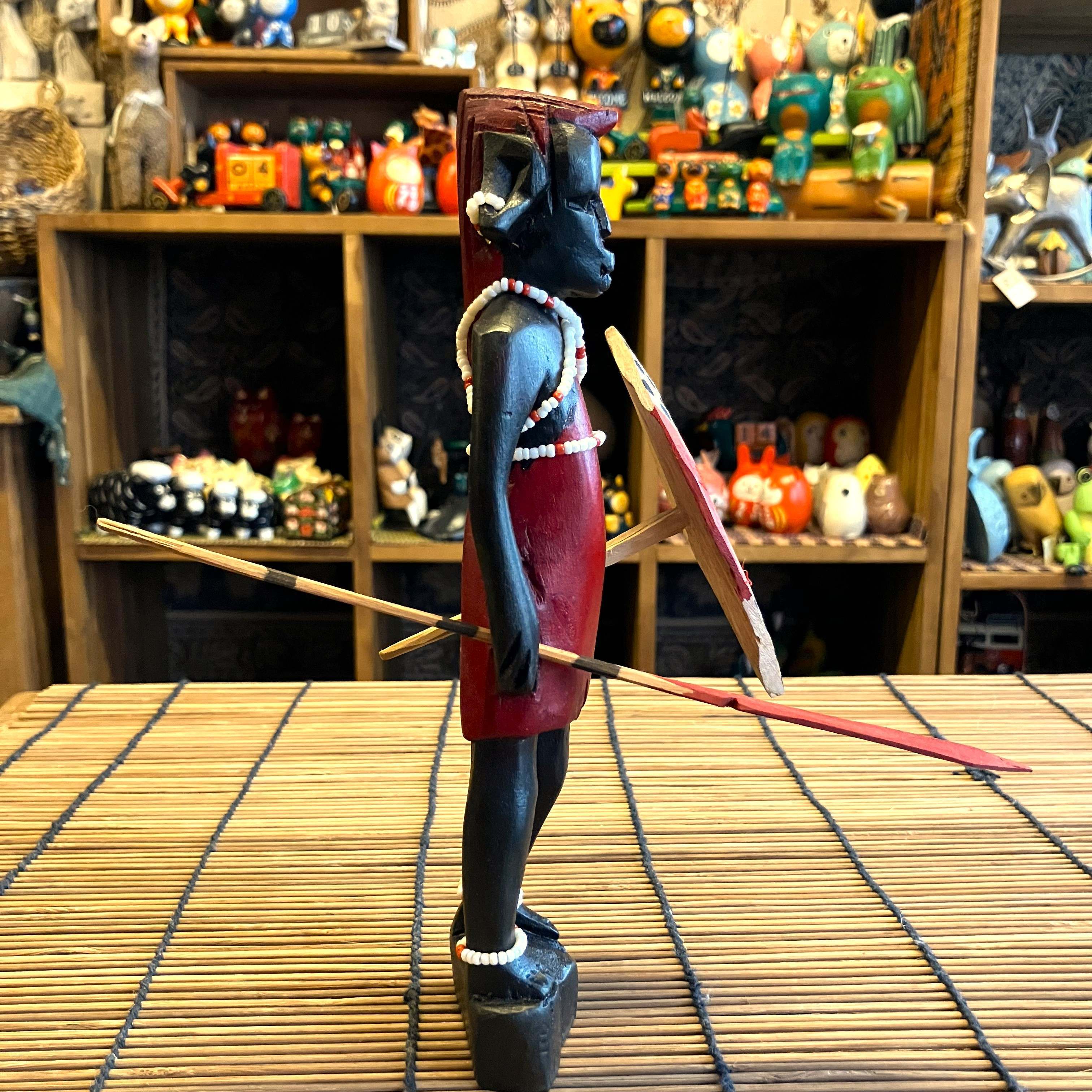 ケニアの手作り、木彫りオブジェでマサイ戦士の人形です。
