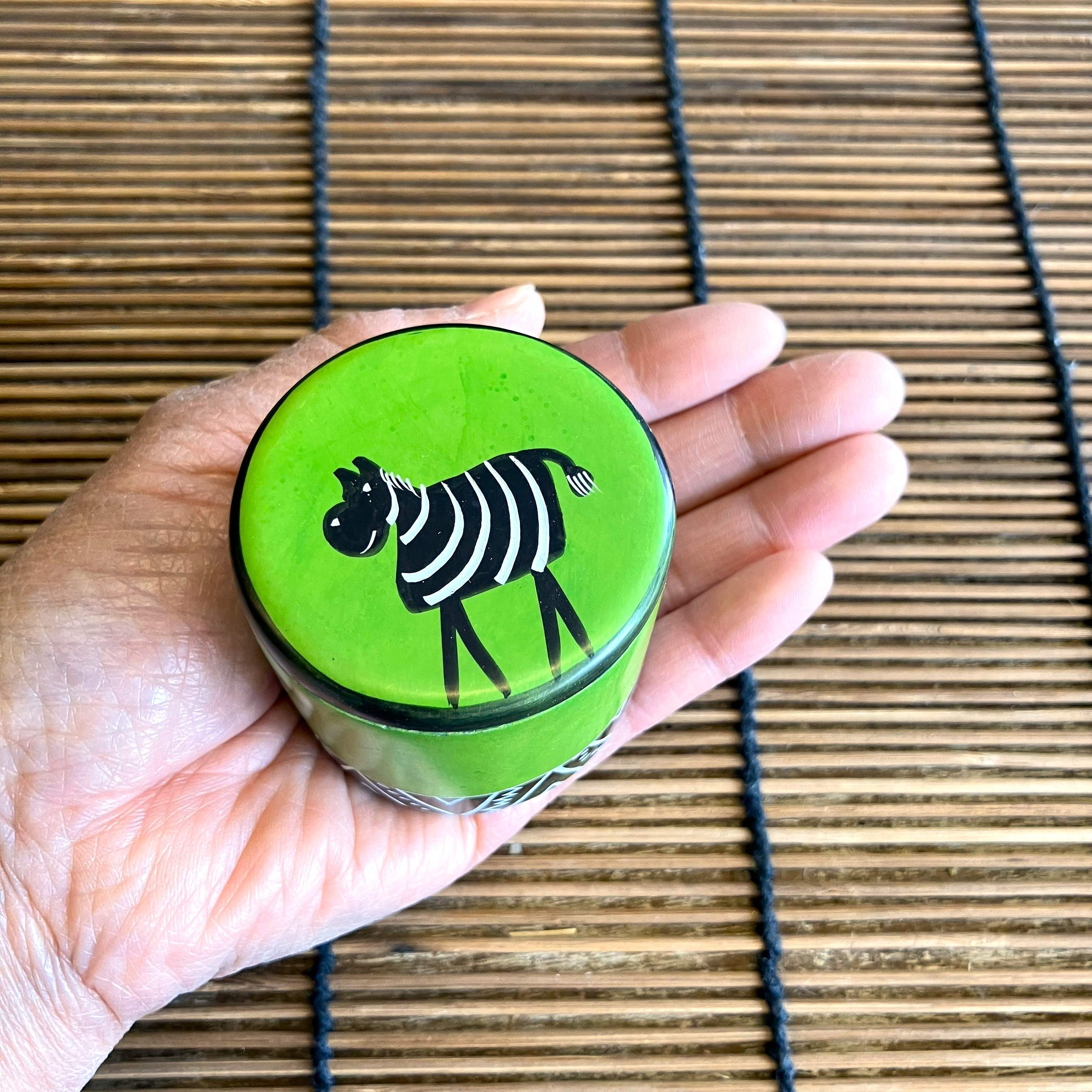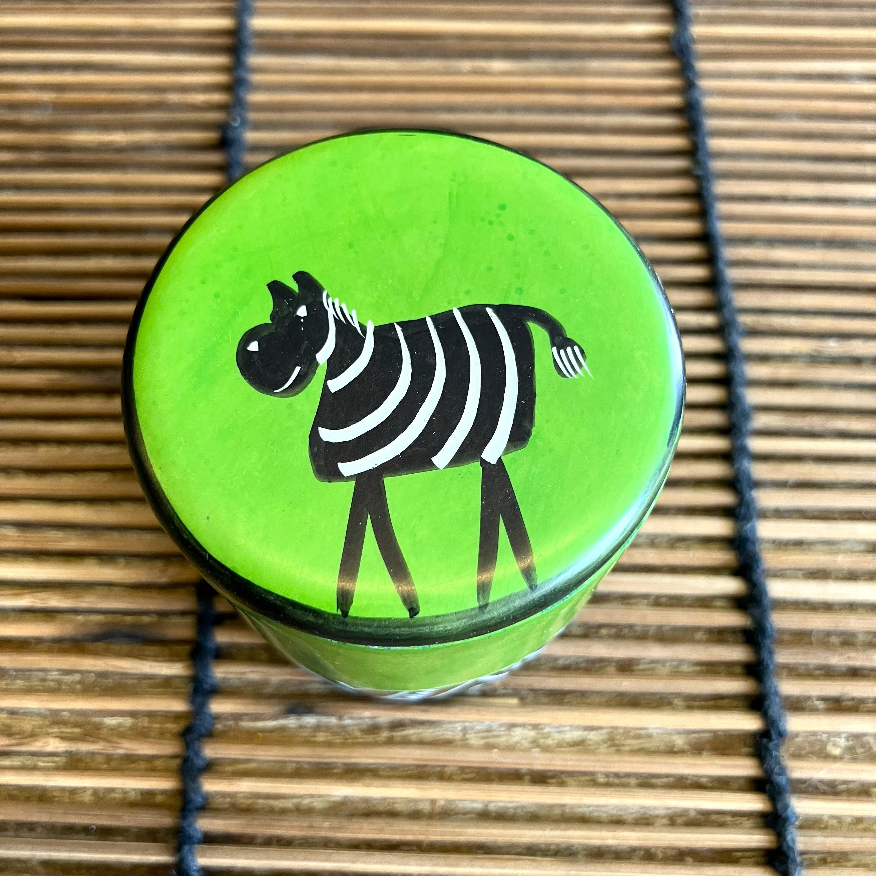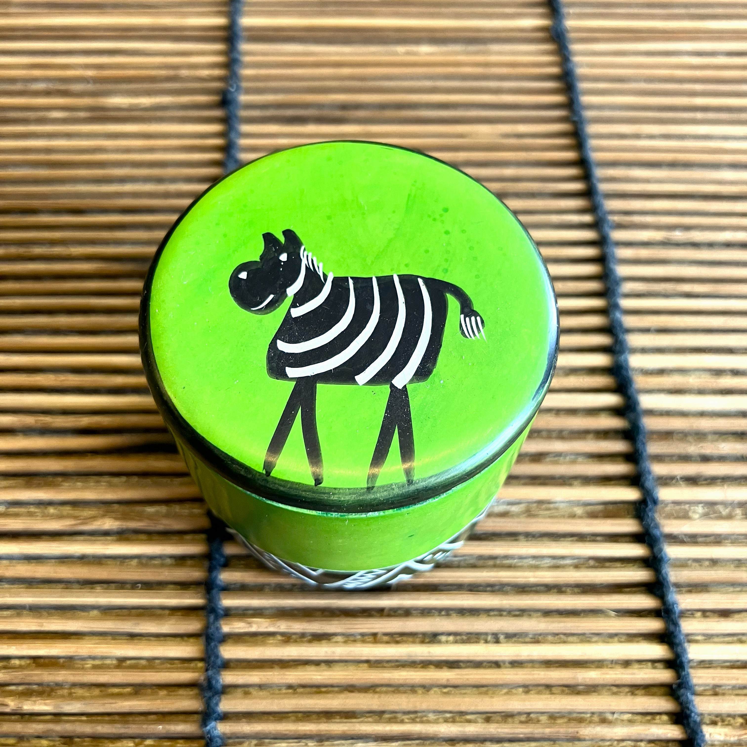 円形の小さなボックス仕様で、グリーン地にシマウマの模様です。