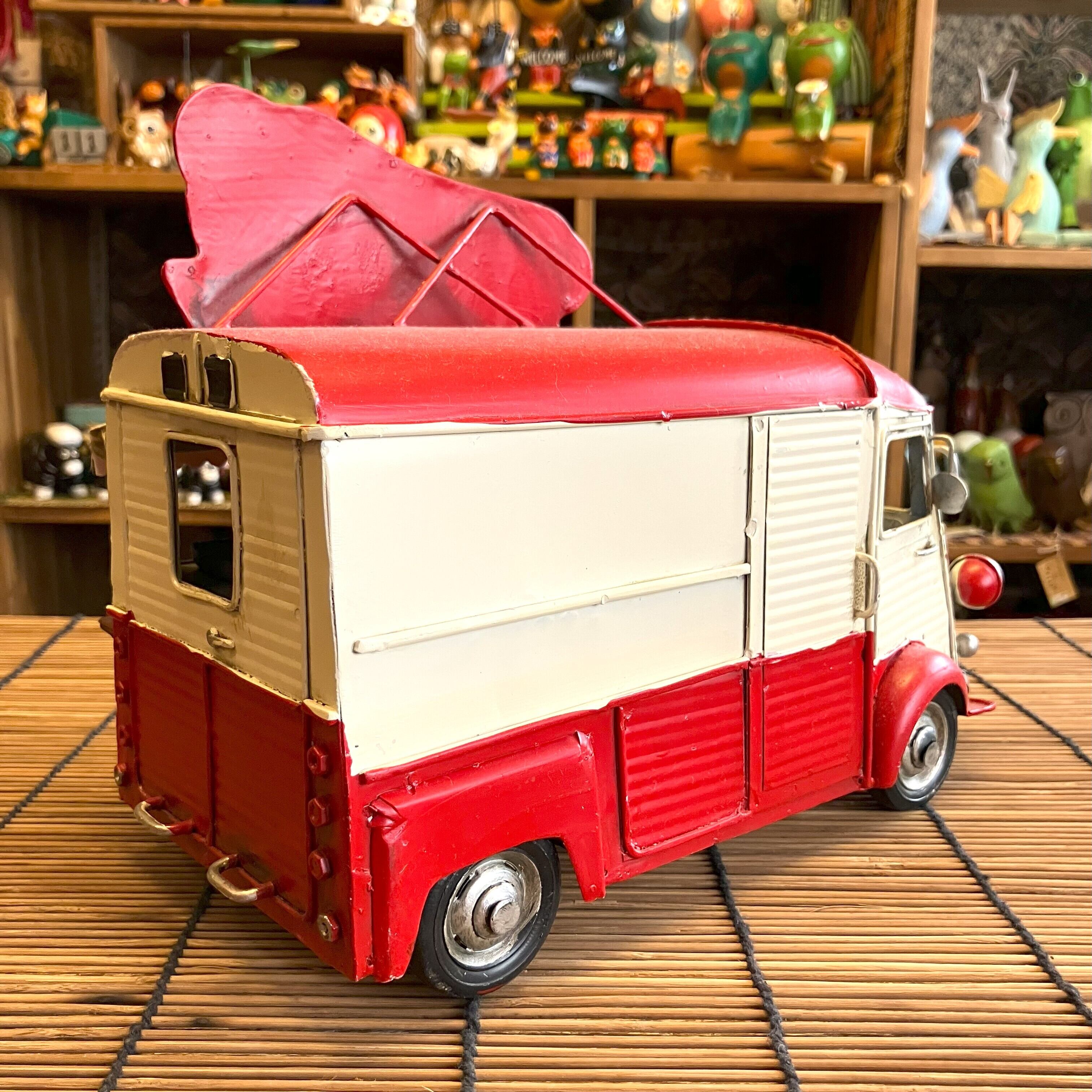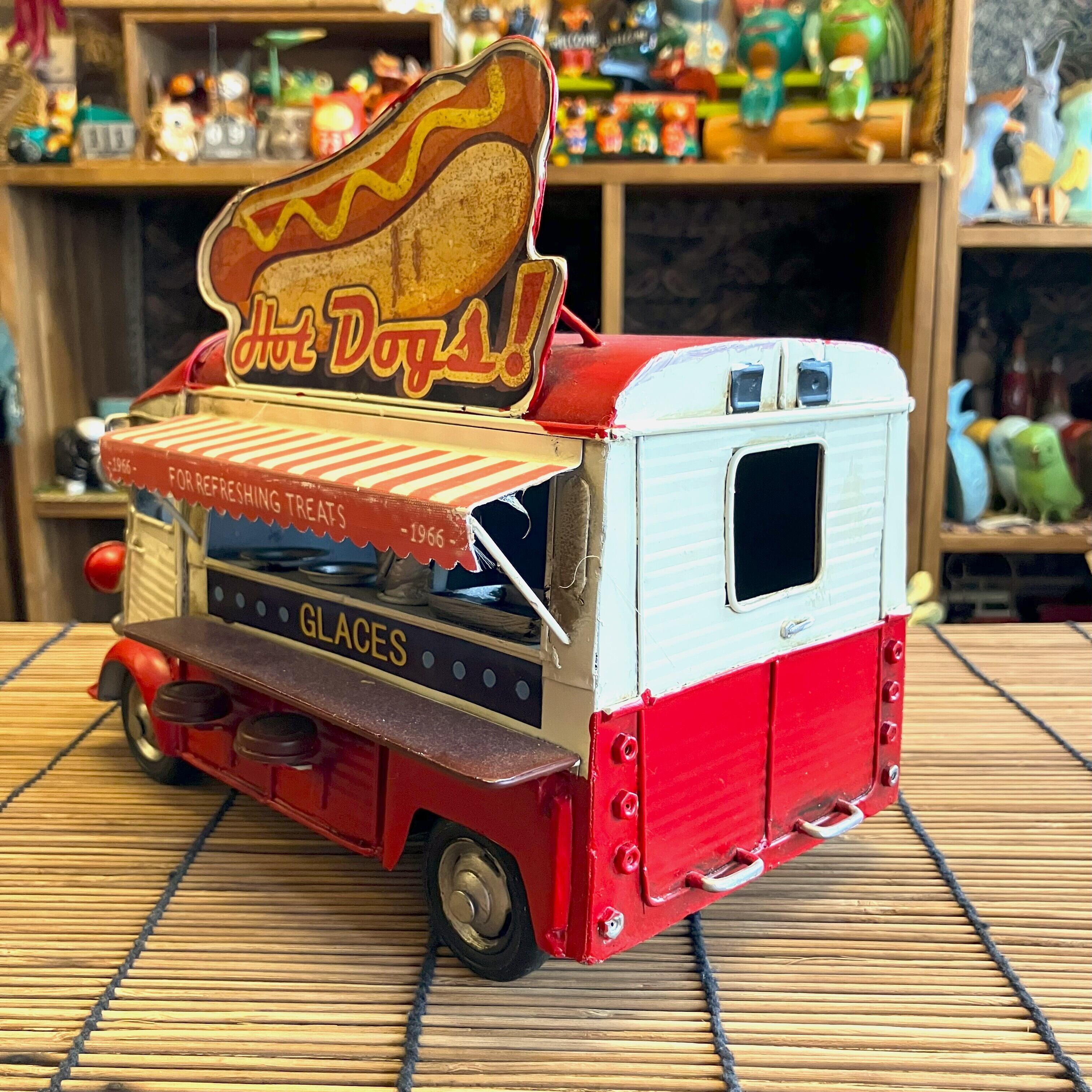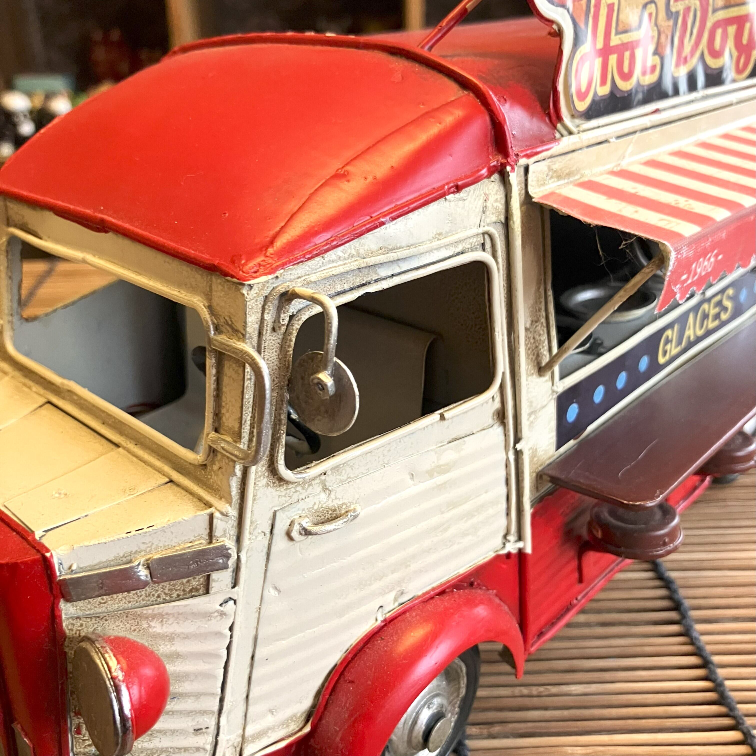 ブリキのキッチンカーオブジェでホットドッグ屋さんです。
