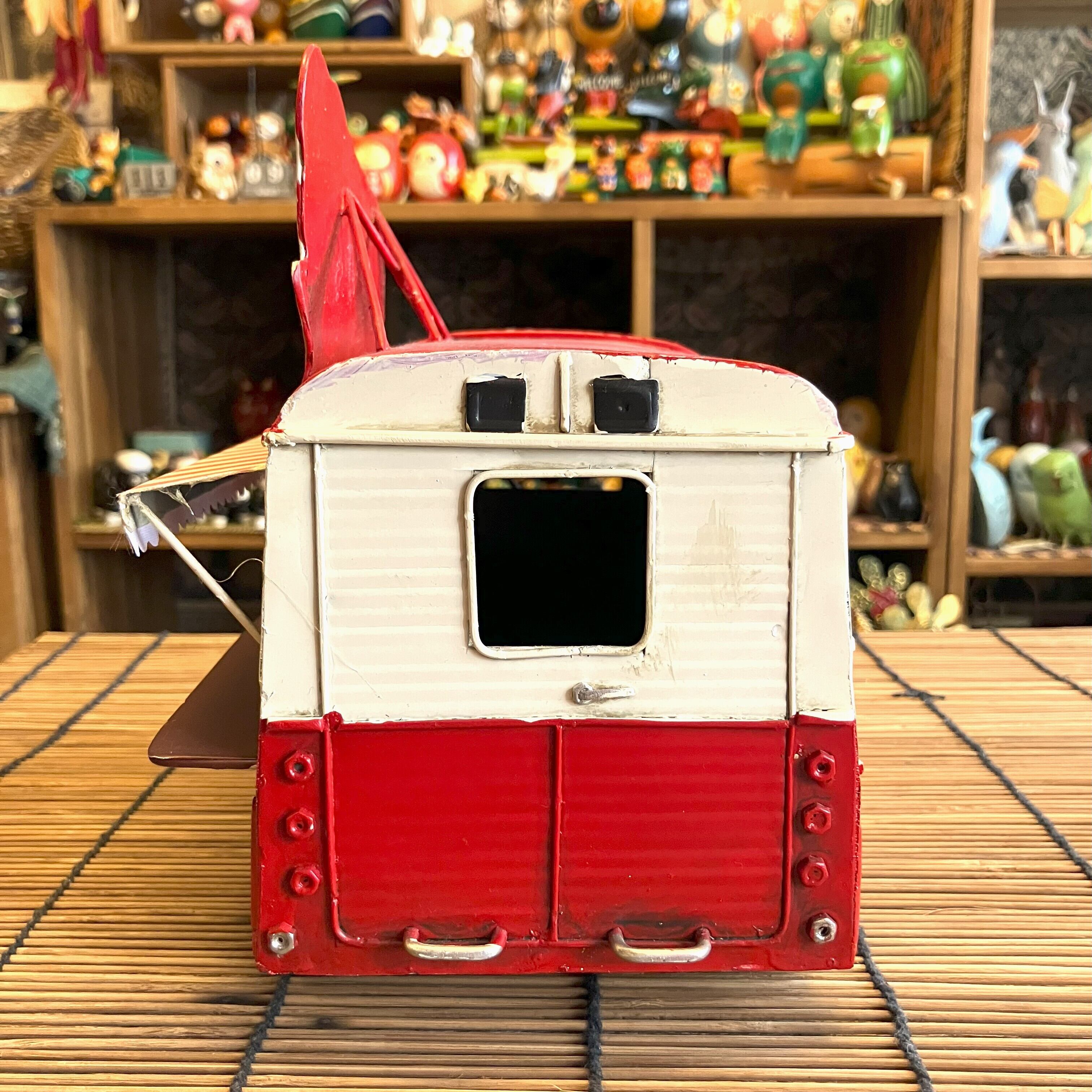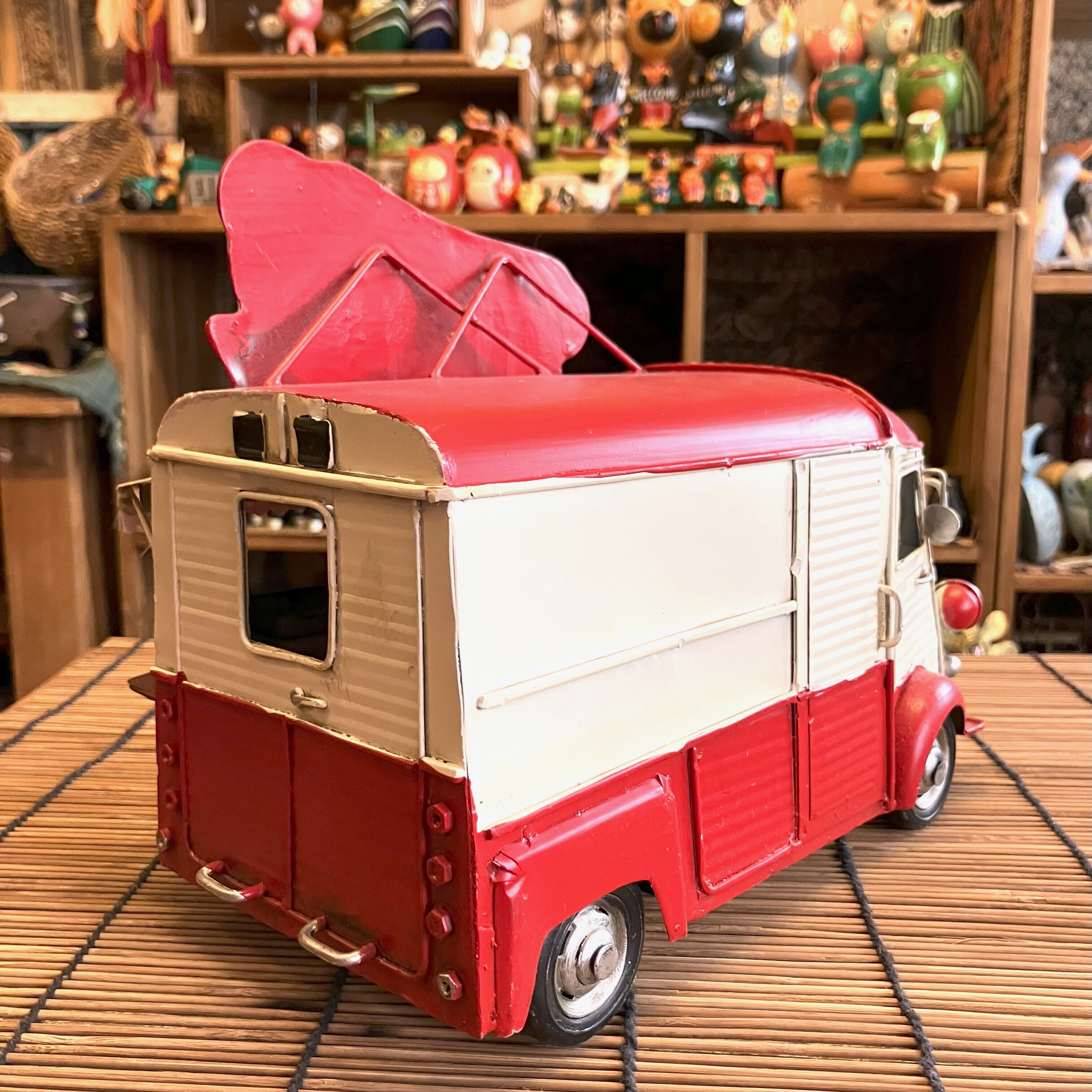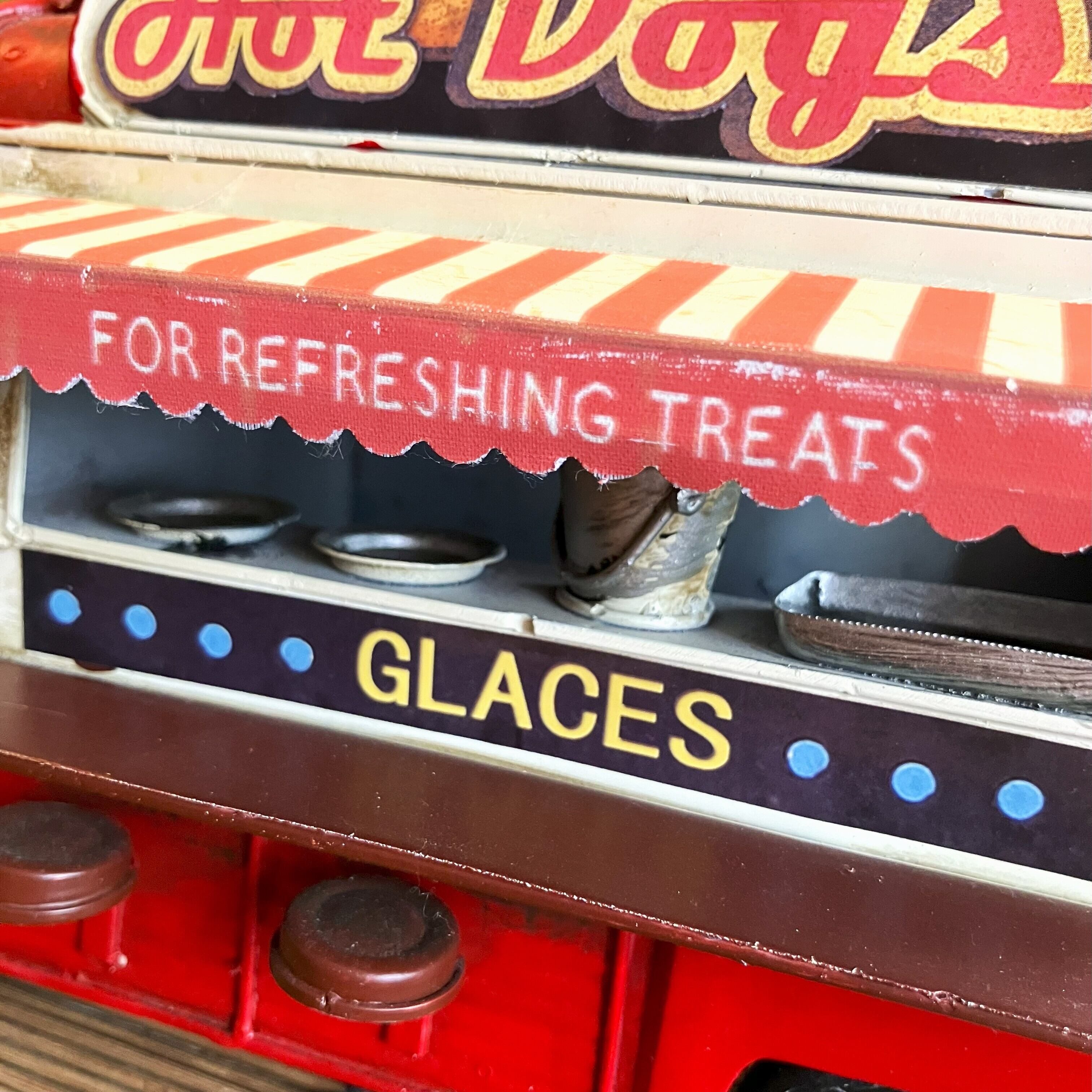 ブリキのキッチンカーオブジェでホットドッグ屋さんです。