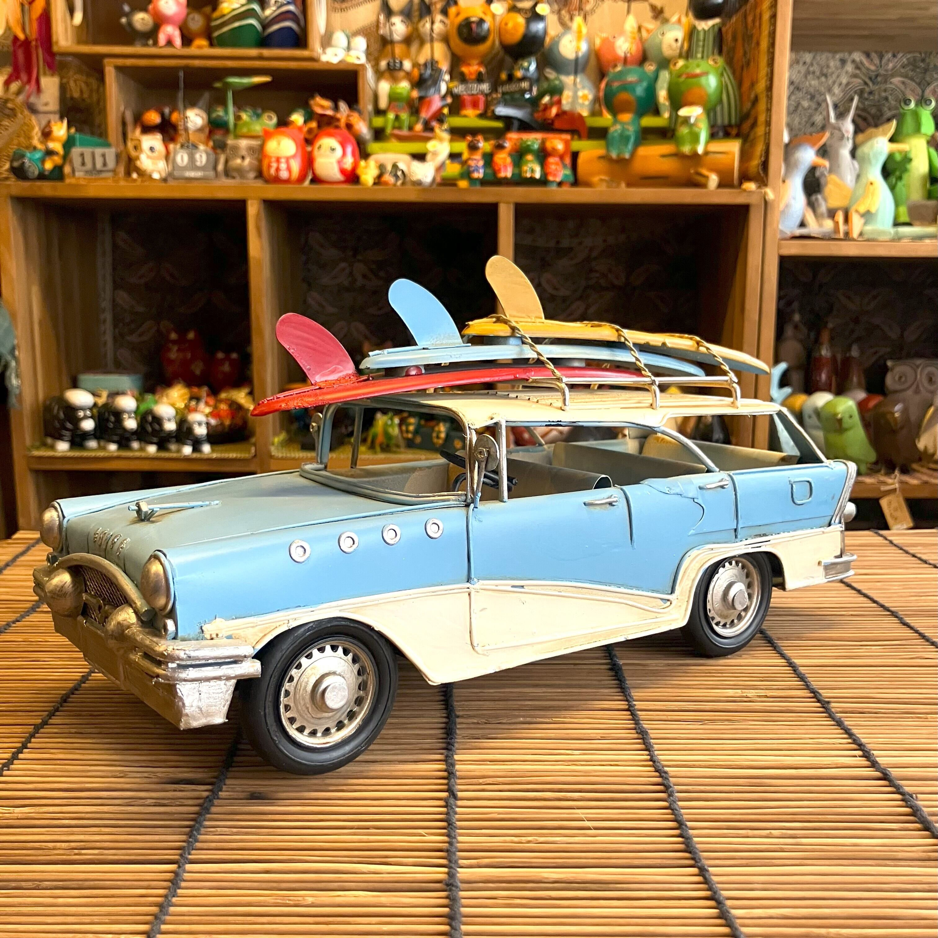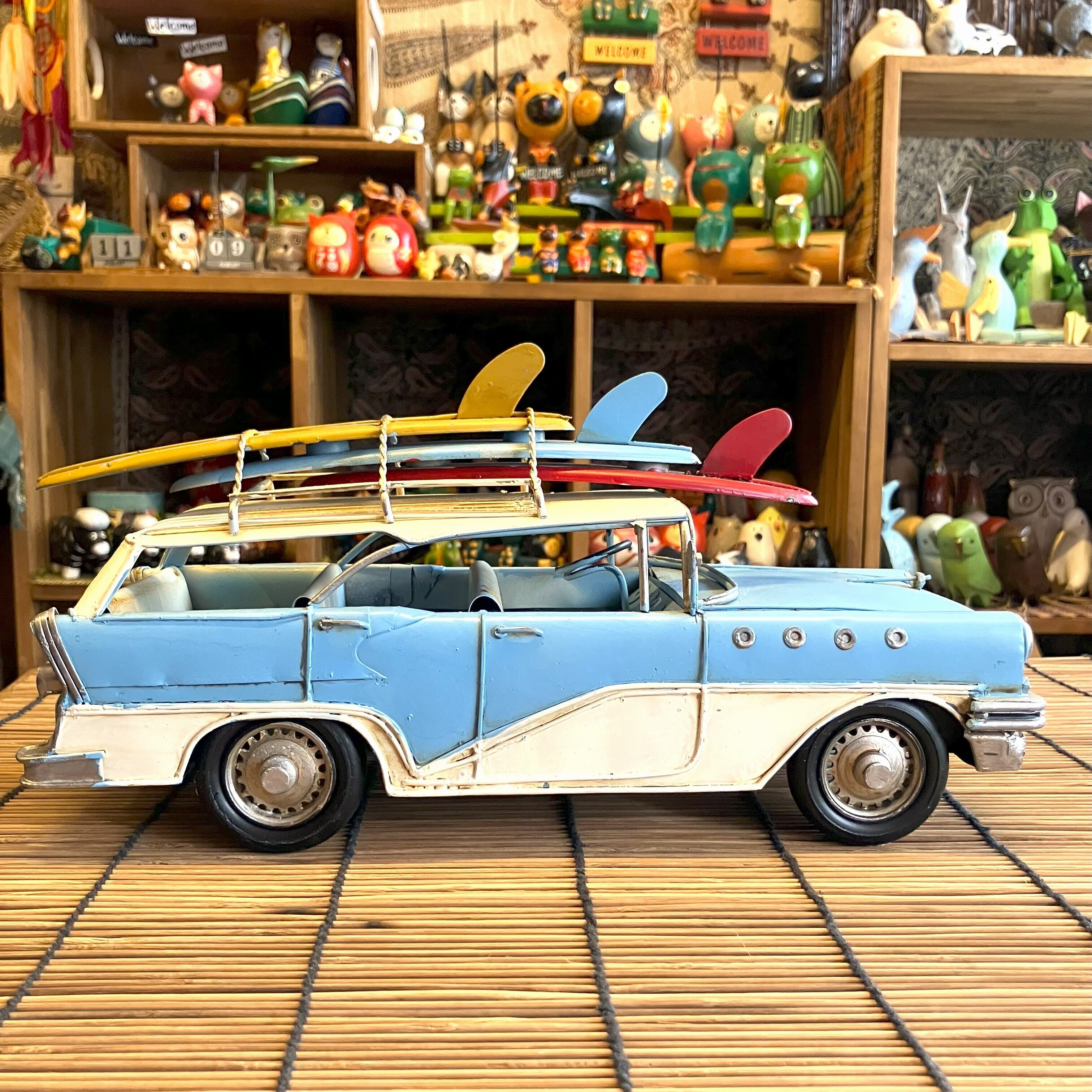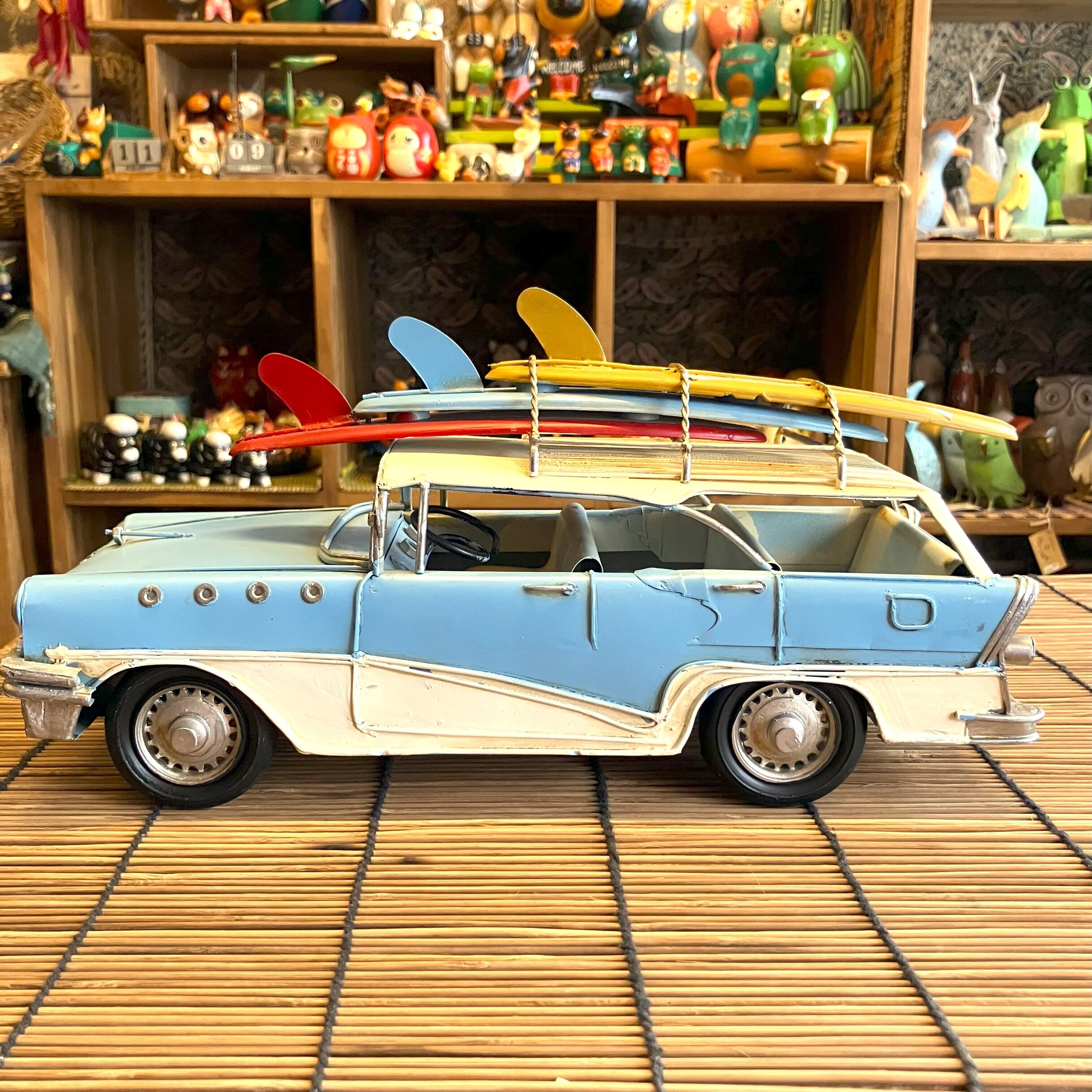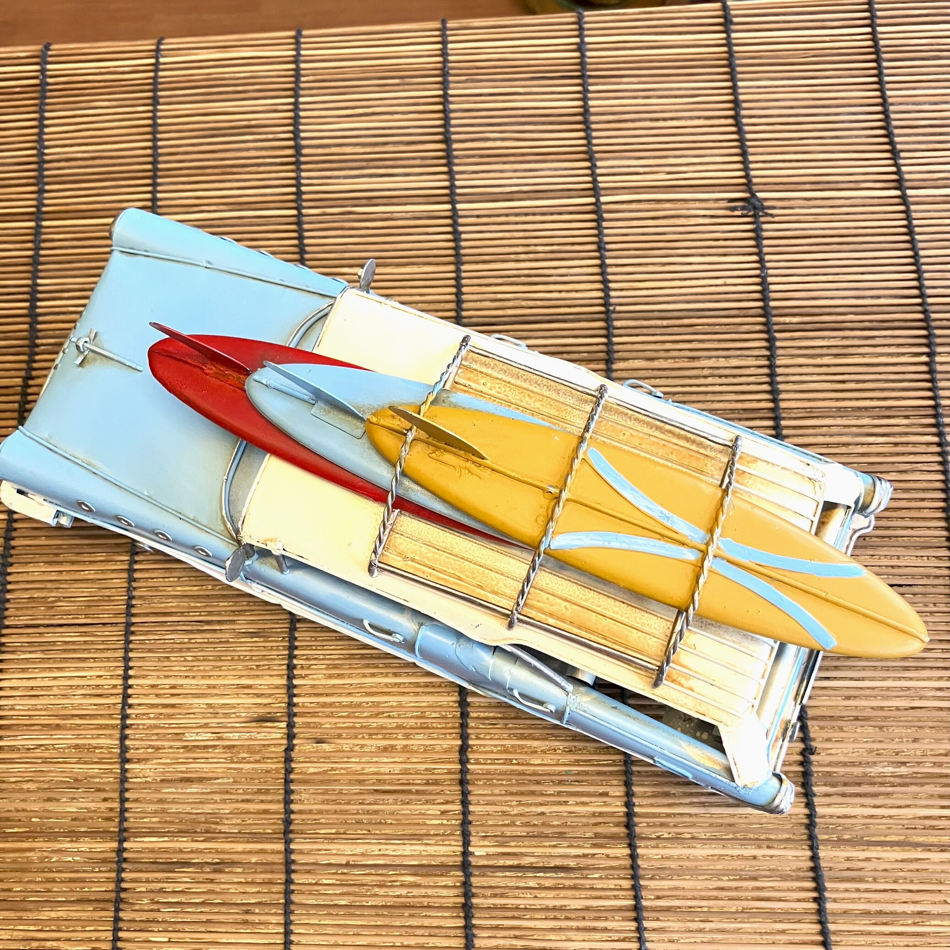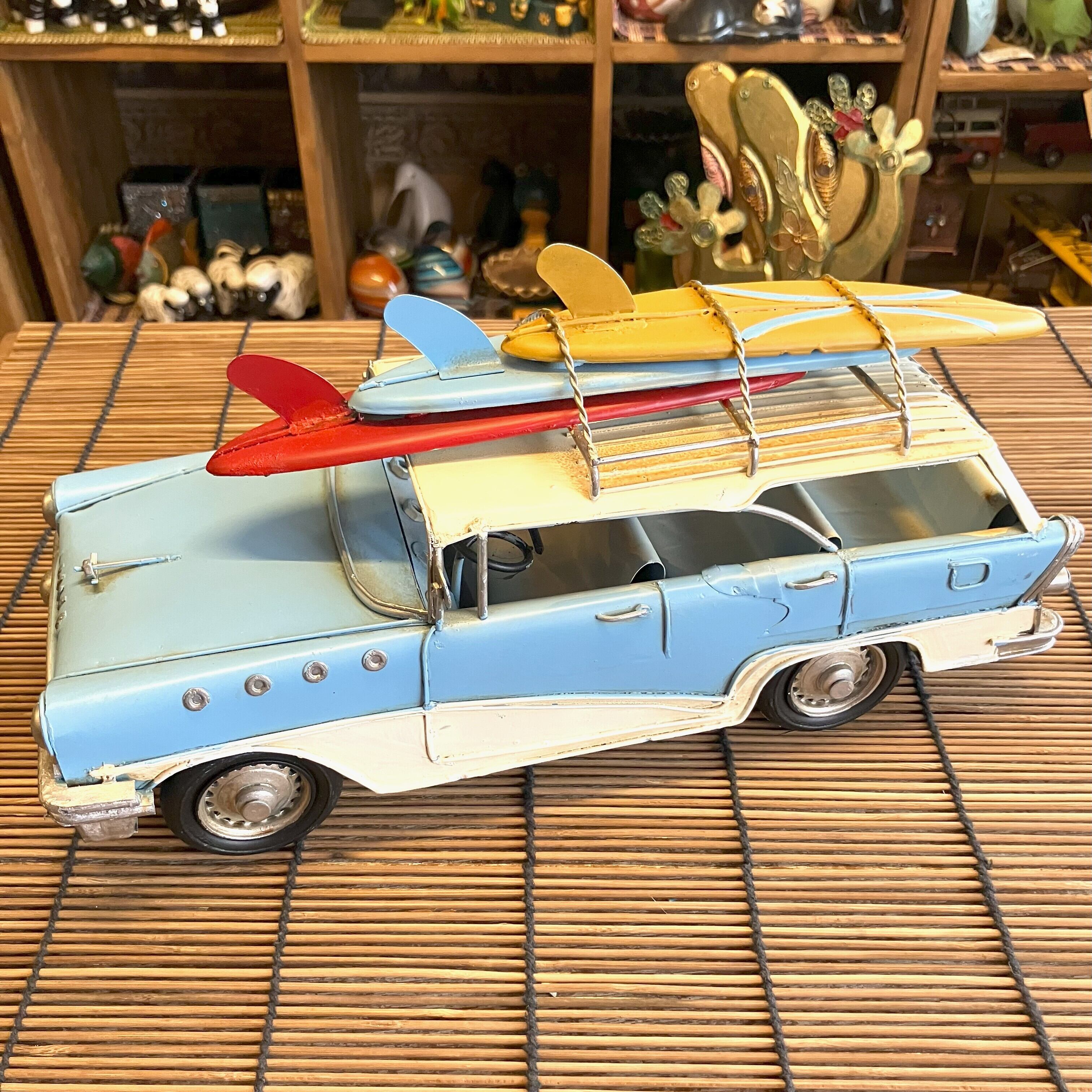 ブリキの車でサーフボードを乗せてたワゴン車です。