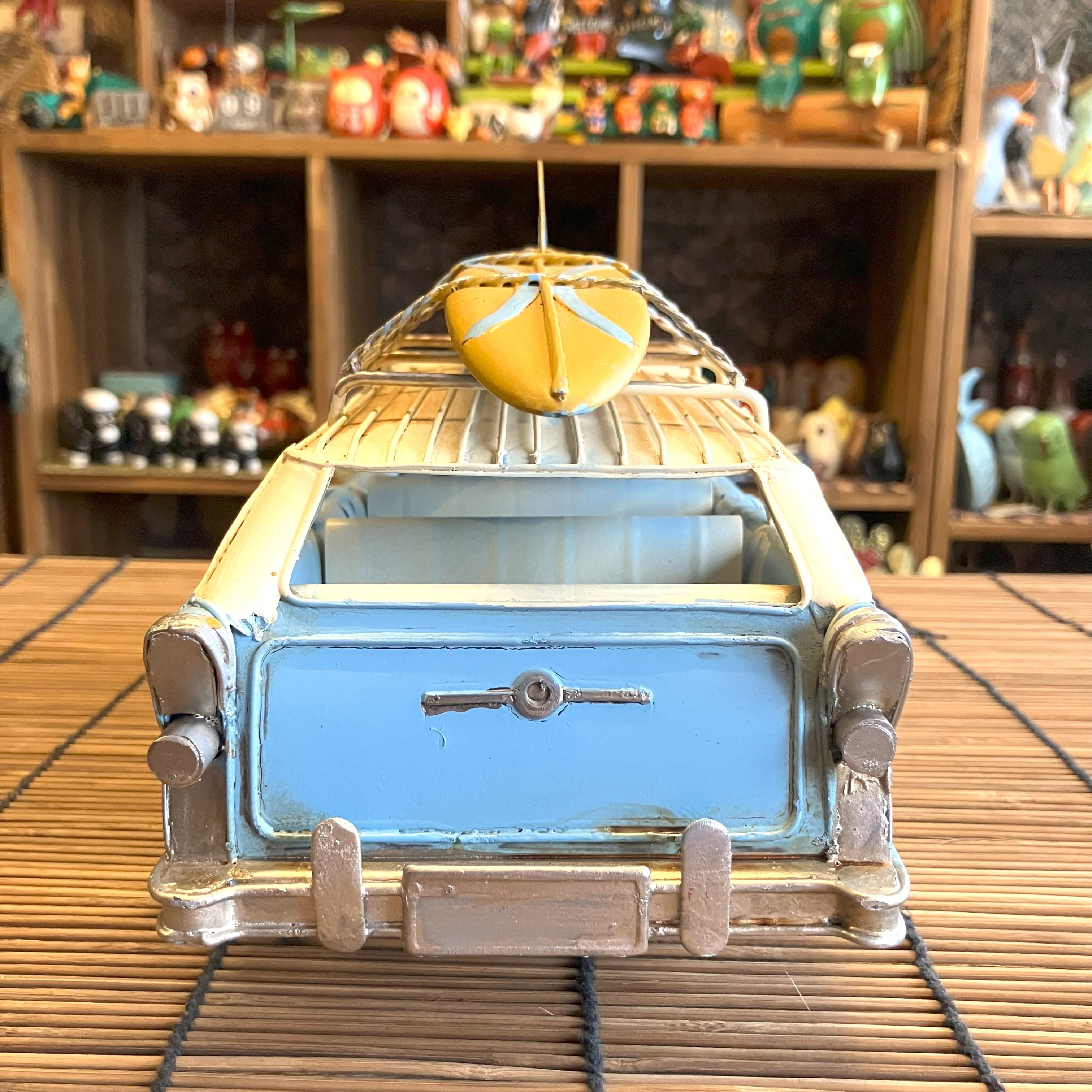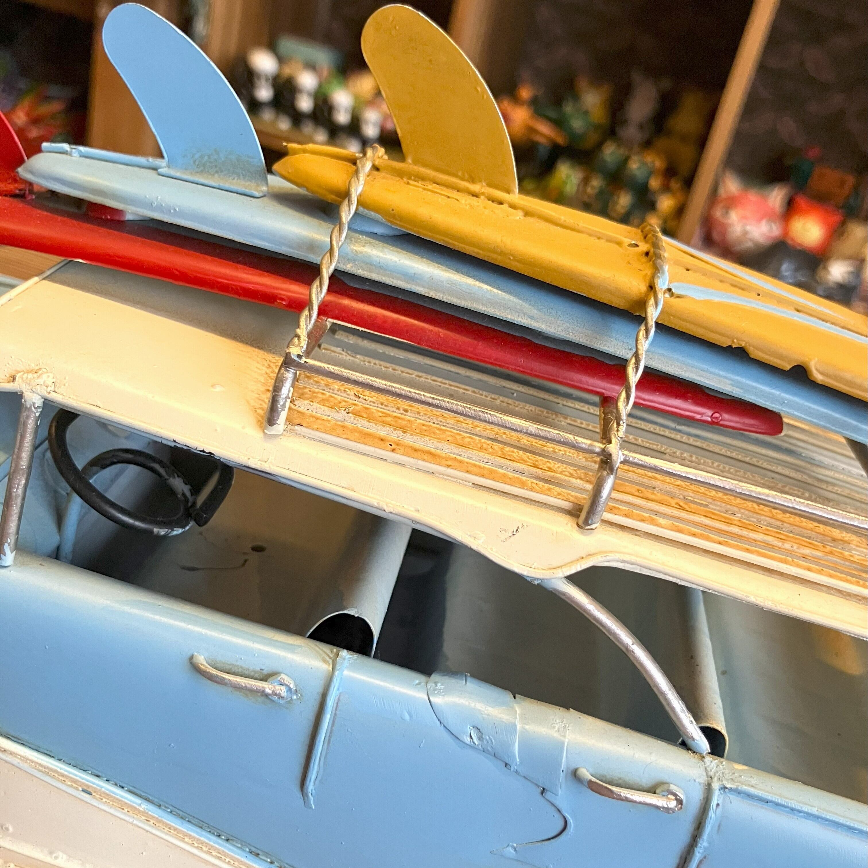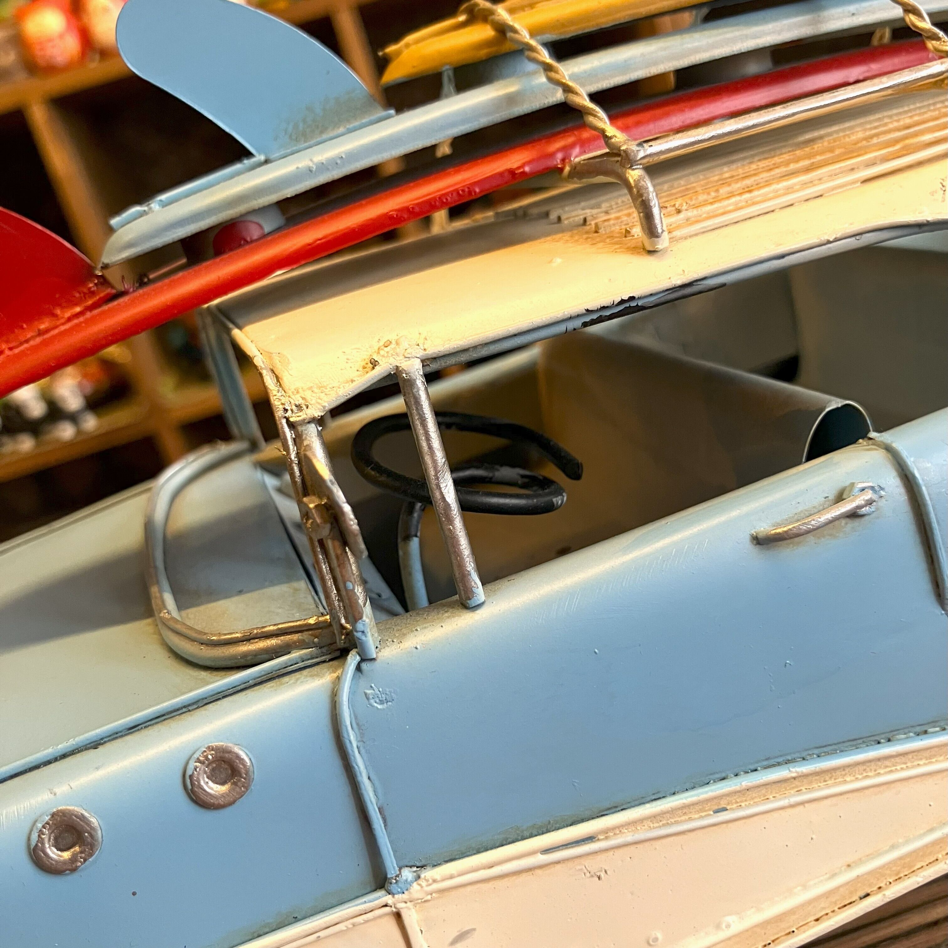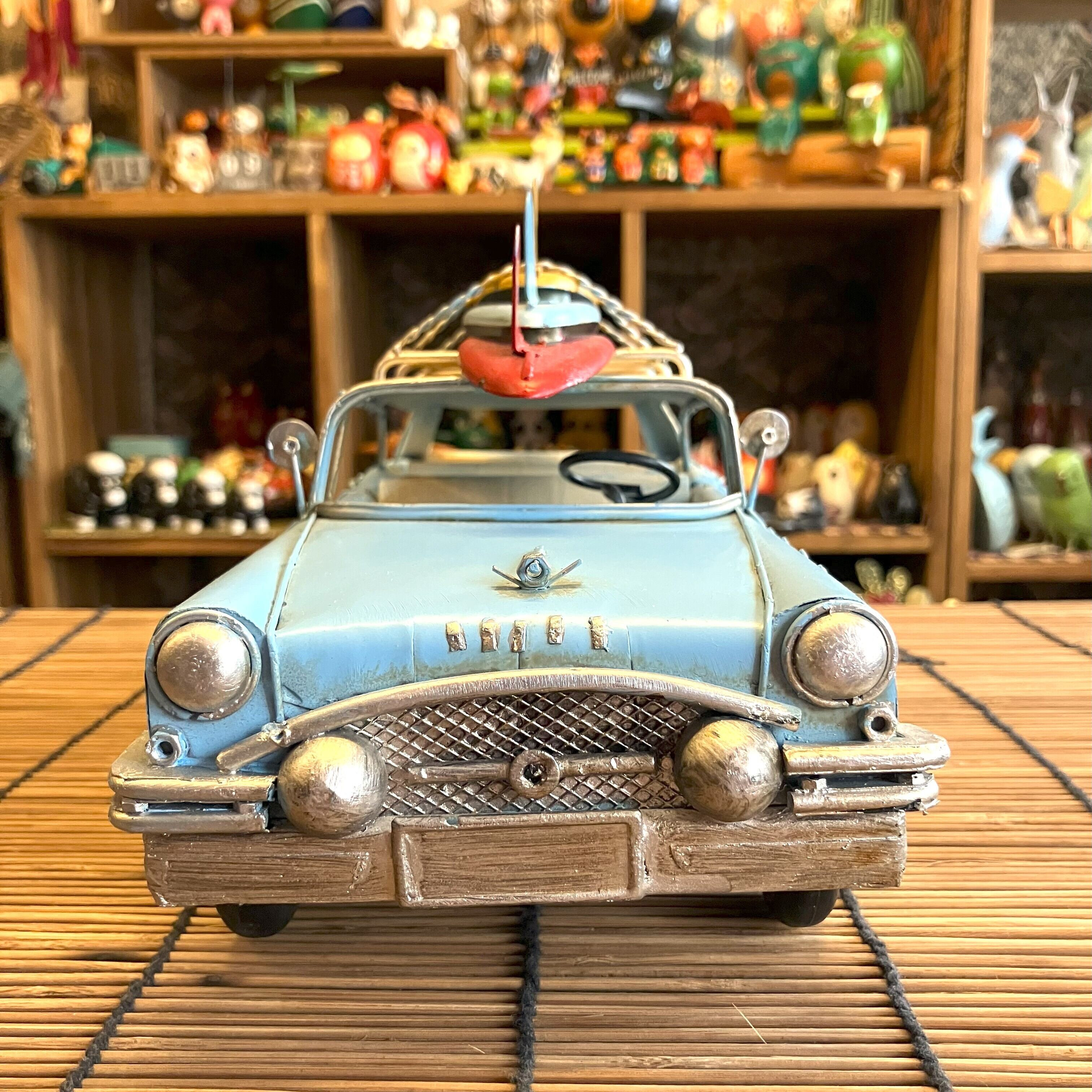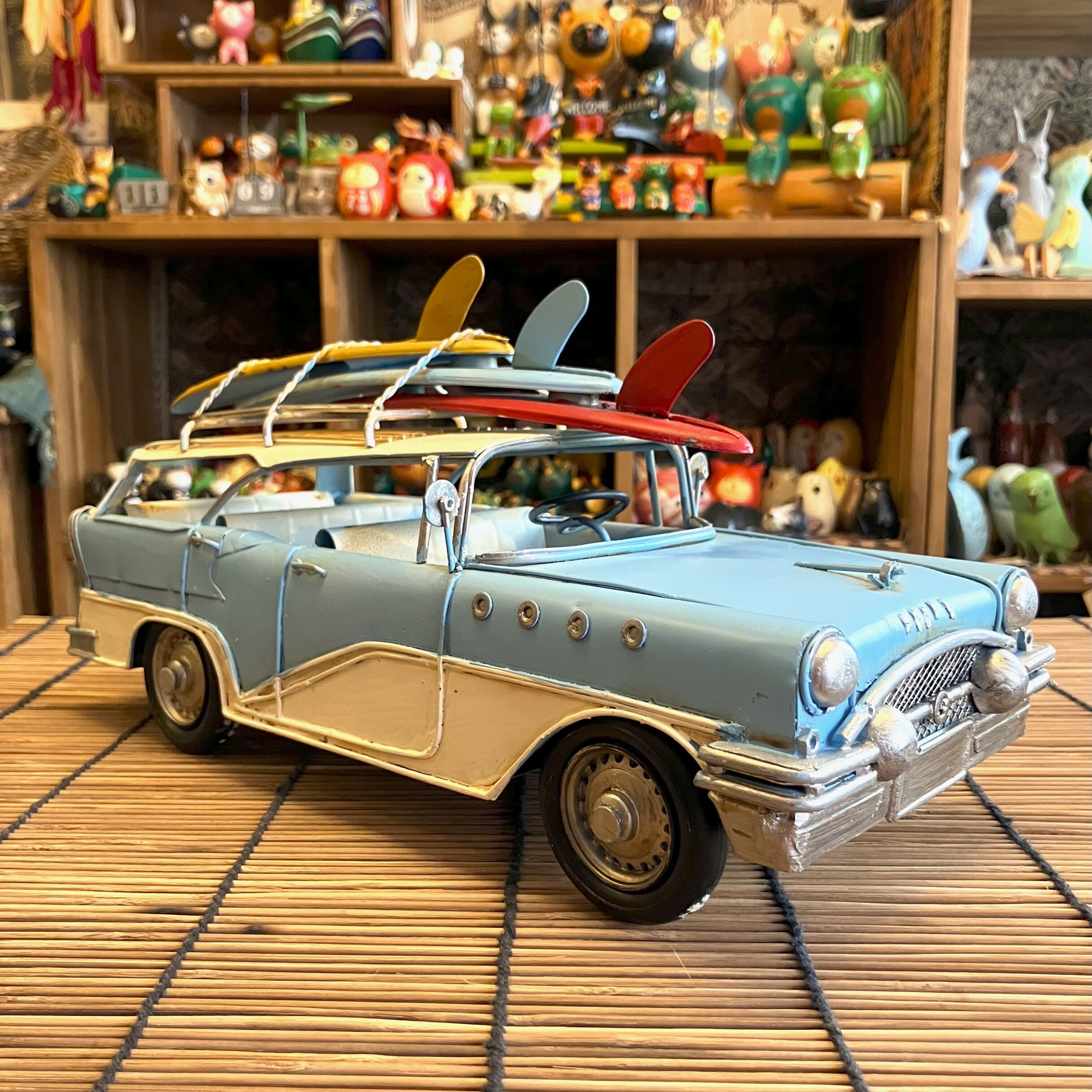 ブリキの車でサーフボードを乗せてたワゴン車です。