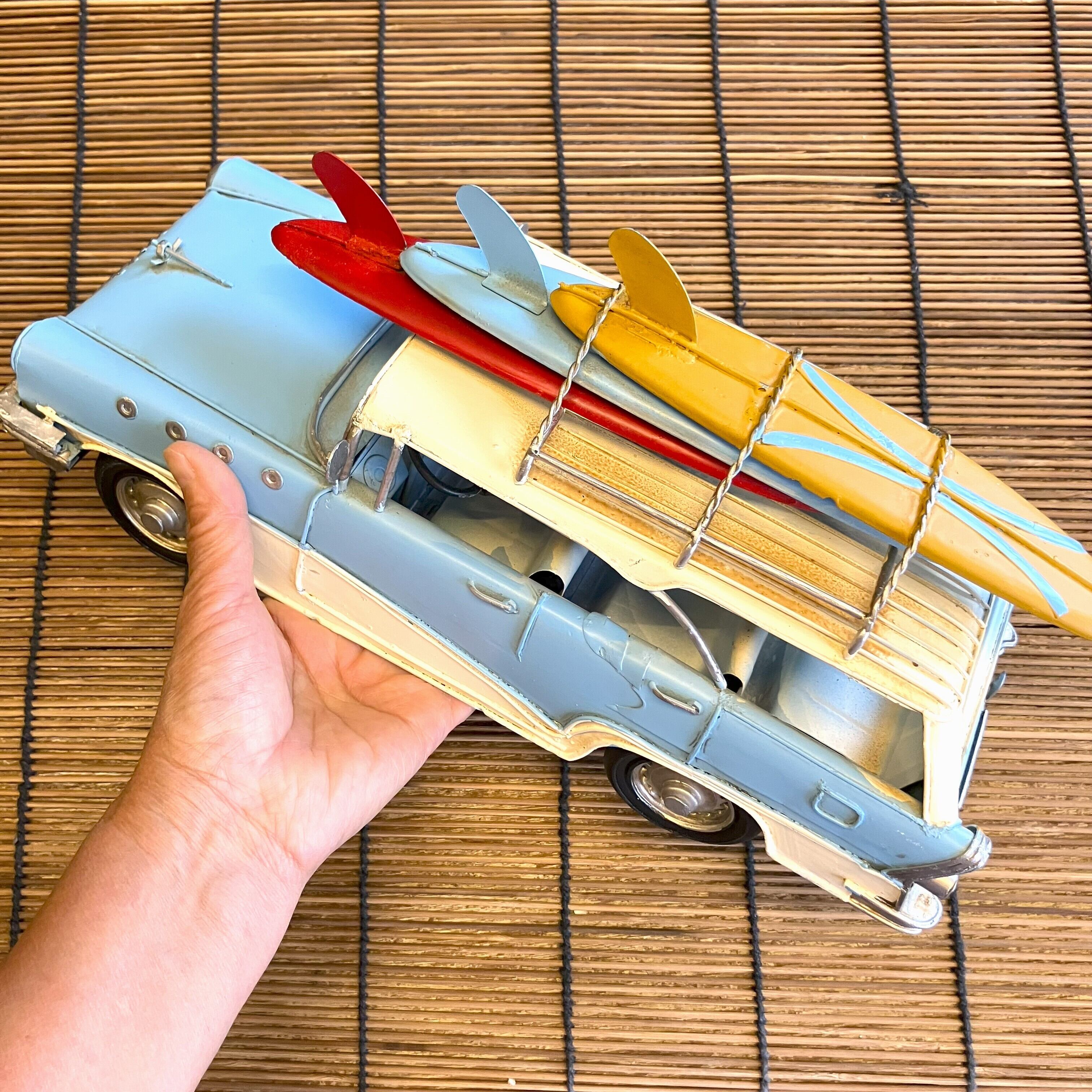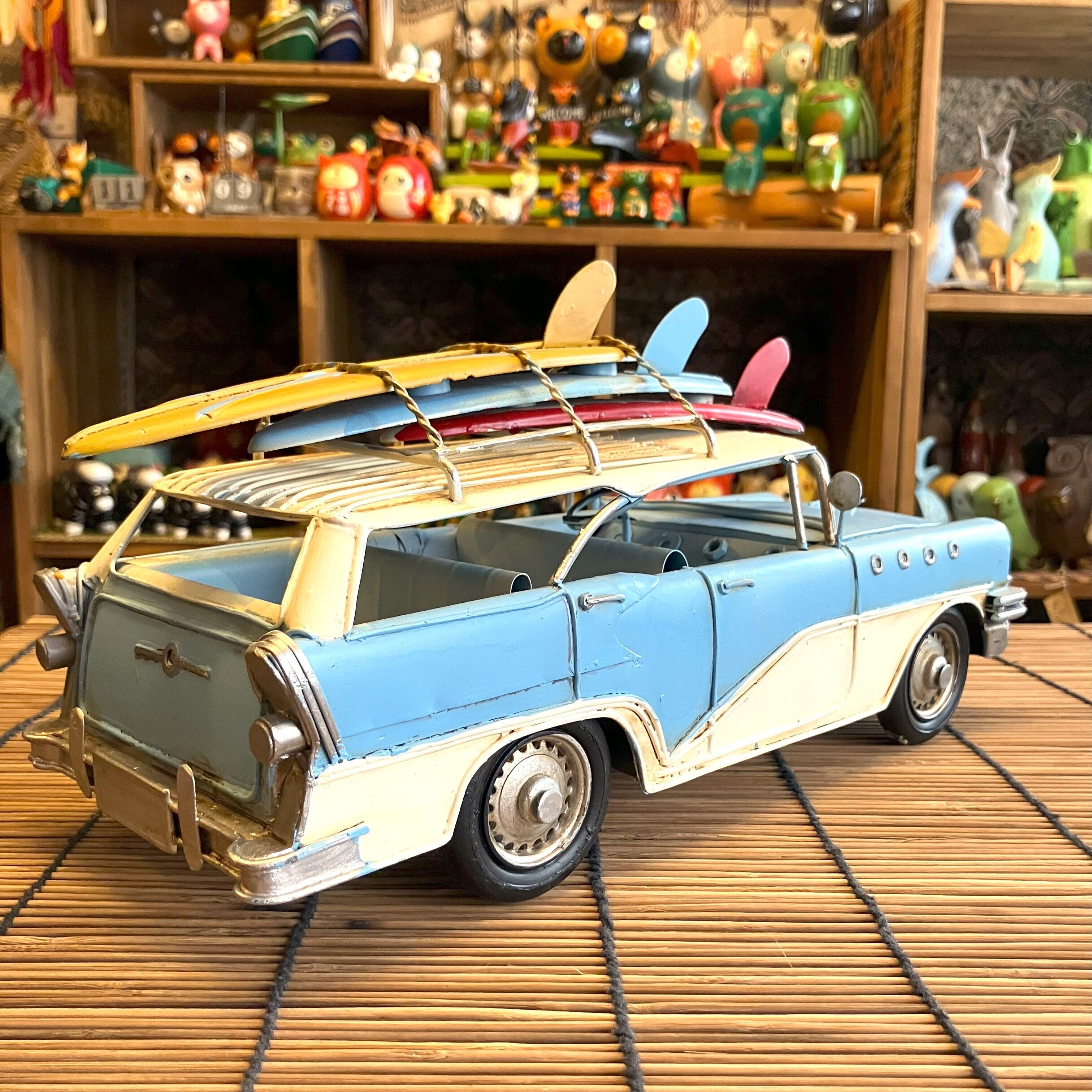 ブリキ 置物 車 ワゴン車 サーフボード乗せ 夏 膿 ブルー レトロ カーオブジェ アメリカン雑貨 お洒落 可愛い インテリア雑貨